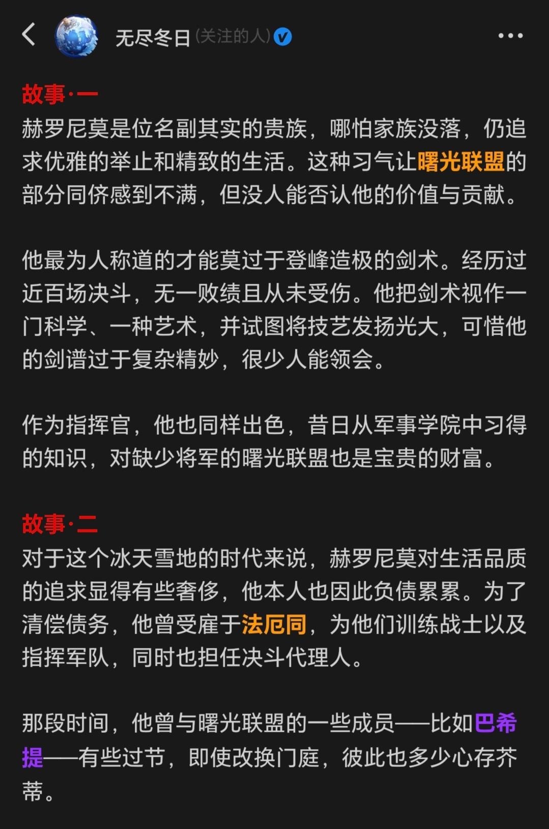 给大家扒一扒赫罗尼莫追妻感情史赫罗尼莫身为旧贵族,在投奔了曙光联盟后爱上了盟里口口相传的“太阳城落难公主”克劳瑞斯(就是这个金发挖肉矿英雄)然后对克劳瑞斯展开了“写情书——被当成坏人——送玫瑰——被拒——送礼物——被拒——高调搞了个超浪漫的场景,送礼送玫瑰还和人家一起坐热气球——小姑娘终于对她笑了”的情节。总之:只要够有钱,就能把到妹(其实长得也不赖,就是太油了所以一开始被拒绝了)#无尽冬日 #