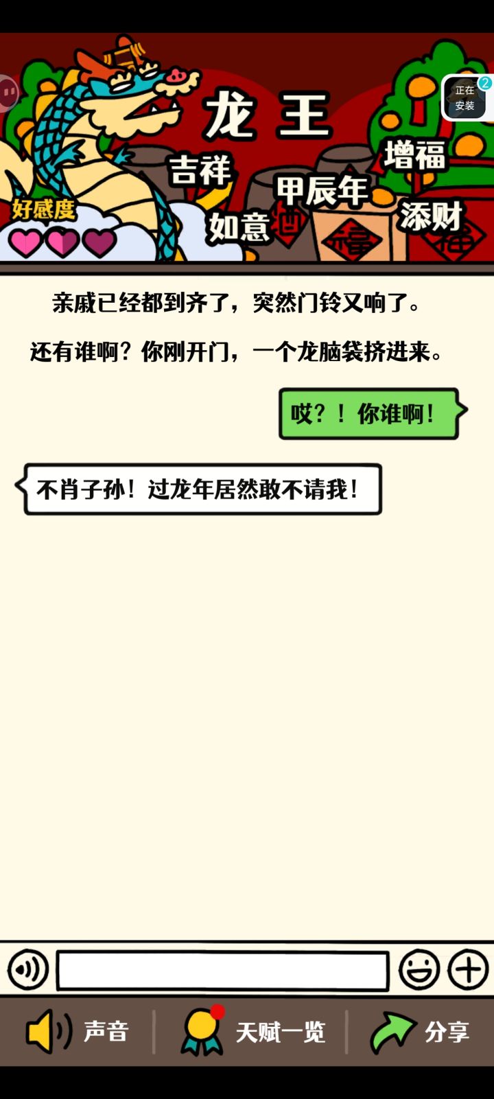 目前我遇见的,一个龙王彩蛋,算是新年祝福吧。还有一个小黄鸭彩蛋,是制作组给玩家的一封信。