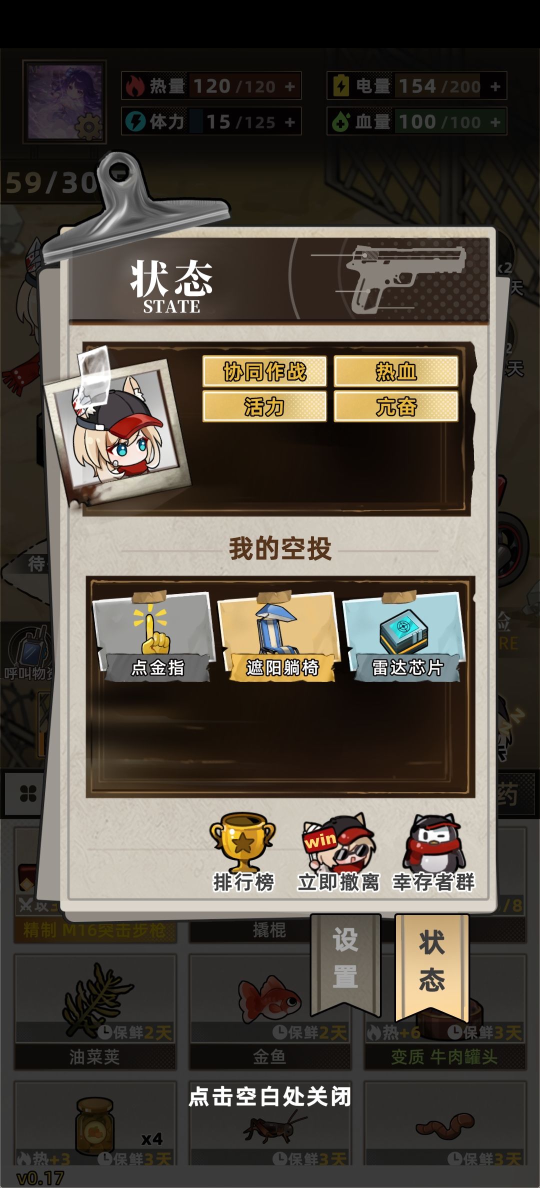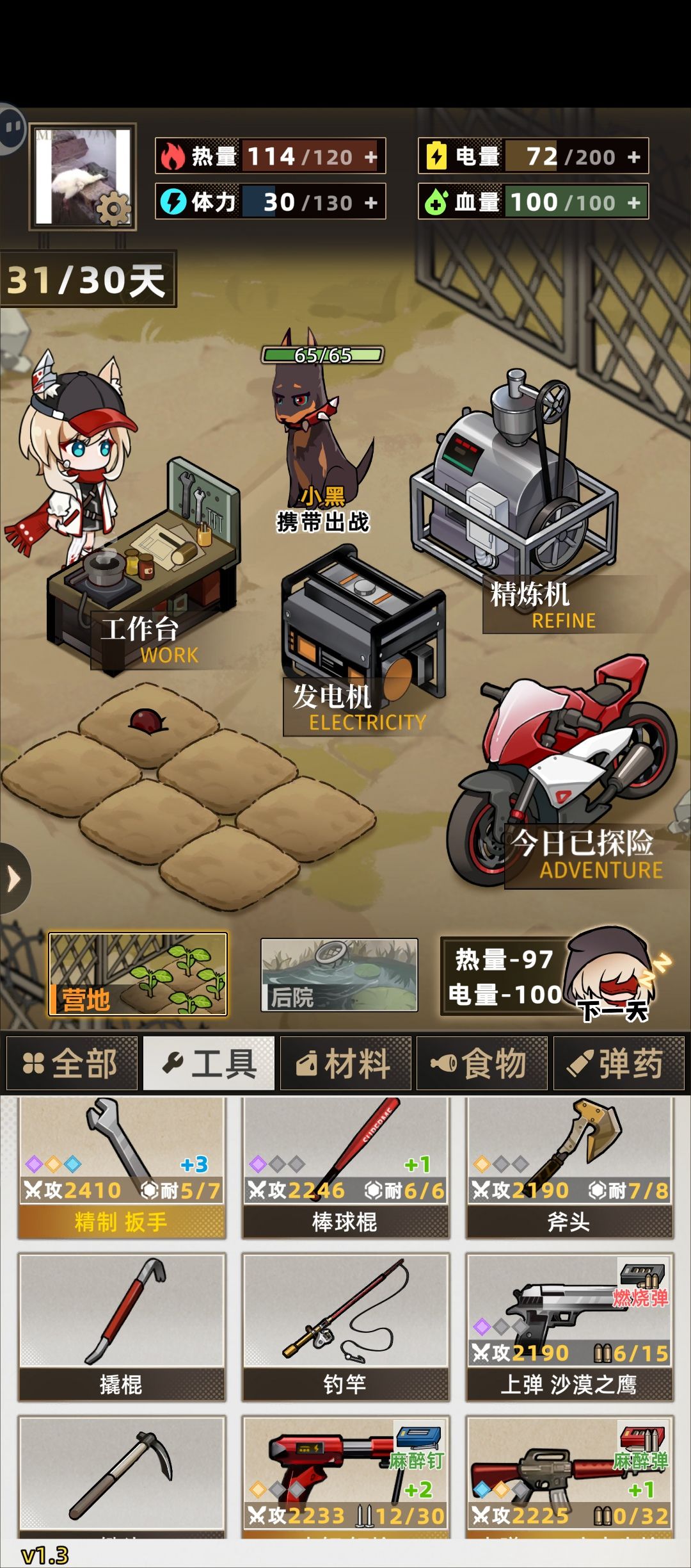开局可以刷空投和手枪词条,空投以金色胶囊为最佳,其余也能用,影响不算太大。 手枪词条紫色【攻击力+30】和攻击百分比都可以,有金色的更舒服。 第一天,第一件事,到后院砍两块木头,和背包里的绳子合成渔网放上,是非常重要的资源点。 第二件事,看广告拿到格外物资,这里推荐高级油必拿,因为当你的电量高于150时,体力上限+25,注意,这里的150是扣完第二天该扣的,还有150,也就是说尽量把自己的电量始终
