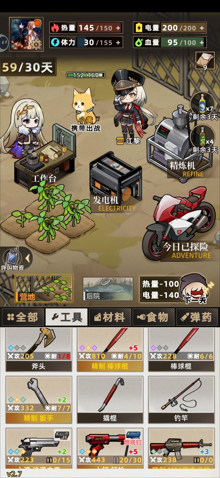 开局天赋拿加体力的药丸,再看广告拿油和狗粮养黑狗,砍树做两个网(两级黑狗天赋点150攻击前期拿把枪乱杀,后期三级点150%攻击直接质变),前期控油190-200每天多25体力(体力最好先推图再做杂物),出门保证热量大于80吃个方便面黄豆荚加伤害,前期优先种豆荚,后期吃黄豆小鱼啥的,豆荚大鱼炼油,最后吃吃喝喝打打怪结束(15关之后一定要先推图再干杂物,尸潮体力不够跑不掉只能等死),狗可以重置生命上限