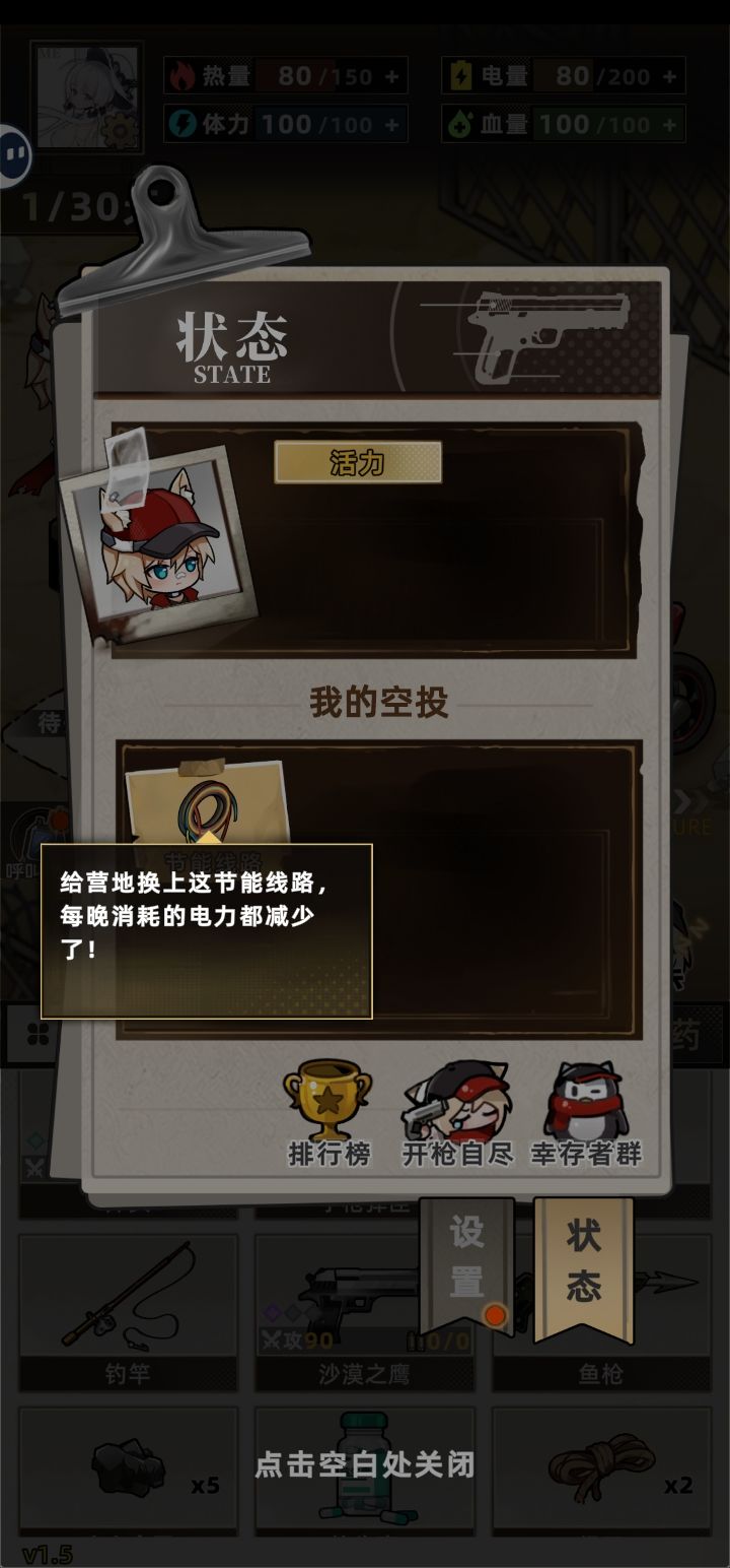 先叠甲:图1展现雷达容错、图2展现运营成果图3:宠物篇图4:空投组篇60通关必须要求:一把50%不消耗体力步枪/钉枪(30%也行)30天:电最低1350 推荐1500(不算调速器) 基础攻略有大佬做了,那么我这边直接上强度。宝子们,跟着节奏。 就决定是你了:点金指-冰箱-雷达 启动开局优先领取:v1.6战备卡、白色点金指 每天后庭抓鱼、上热血、活力、亢奋,做渔网等,(每天必备不会过多说