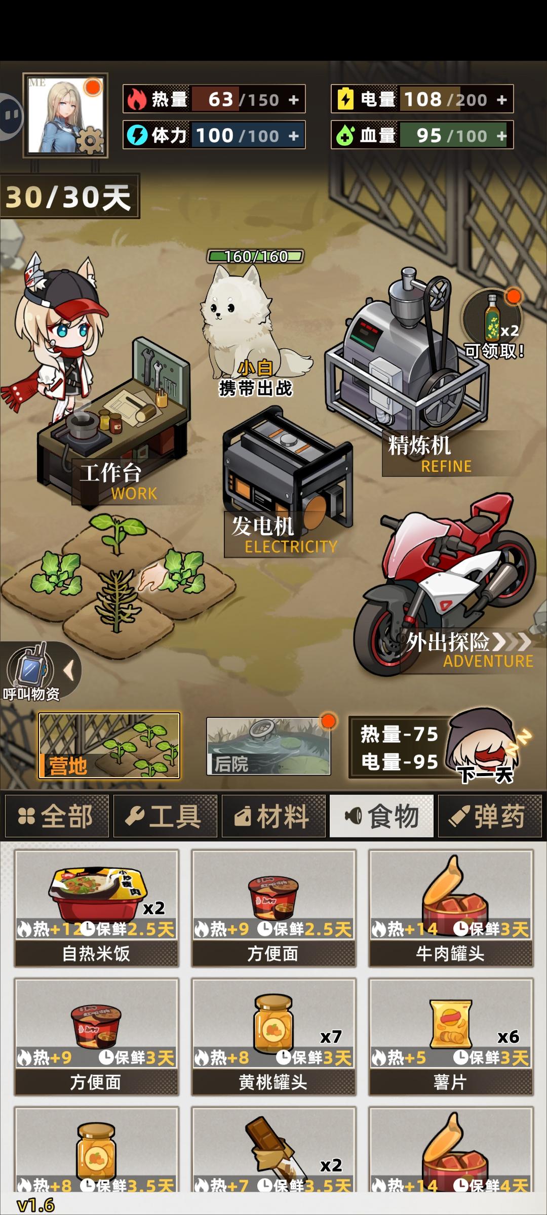 也终于把5级狗狗完成了,虽然喂出最后一级点出2级主动承伤时已经是第57天了,不过作为攻击白,小白那75%概率的扛伤也真帮我扛了一次致命伤,谢谢小白!开局选了自由女神像后,前十天我就尽量搜军营,拿武器、油、废铁、狗粮,运气挺好的出了芯片和三把50%体力的武器、两把50%眩晕的武器,食物浪费的很少因为前期我搜到的就很少,前期出1、3、7瓶鱼油的鱼尽量用来炼油了。后来食物开始紧张了就不