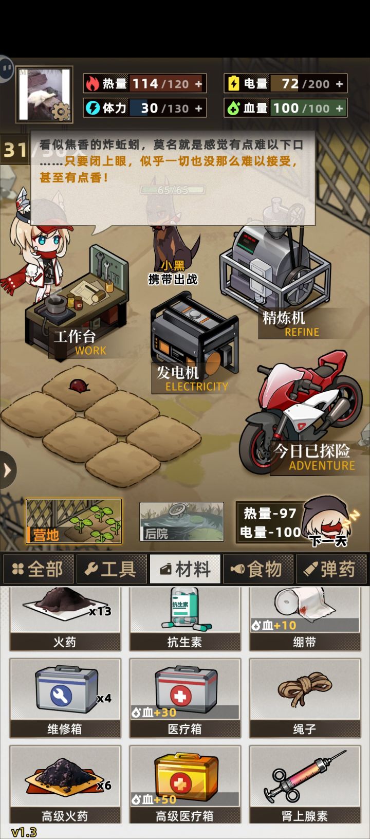 开局天赋拿加体力的药丸,再看广告拿油和狗粮养黑狗,砍树做两个网(两级黑狗天赋点150攻击前期拿把枪乱杀,后期三级点150%攻击直接质变),前期控油190-200每天多25体力(体力最好先推图再做杂物),出门保证热量大于80吃个方便面黄豆荚加伤害,前期优先种豆荚,后期吃黄豆小鱼啥的,豆荚大鱼炼油,最后吃吃喝喝打打怪结束(15关之后一定要先推图再干杂物,尸潮体力不够跑不掉只能等死),狗可以重置生命上限