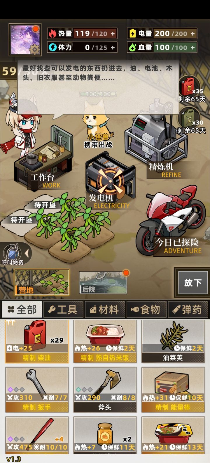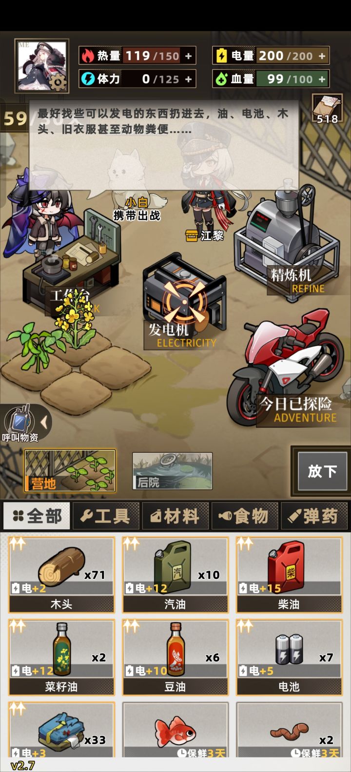 开局可以刷空投和手枪词条,空投以金色胶囊为最佳,其余也能用,影响不算太大。手枪词条紫色【攻击力+30】和攻击百分比都可以,有金色的更舒服。第一天,第一件事,到后院砍两块木头,和背包里的绳子合成渔网放上,是非常重要的资源点。第二件事,看广告拿到格外物资,这里推荐高级油必拿,因为当你的电量高于150时,体力上限+25,注意,这里的150是扣完第二天该扣的,还有150,也就是说尽量把自己的电量始终