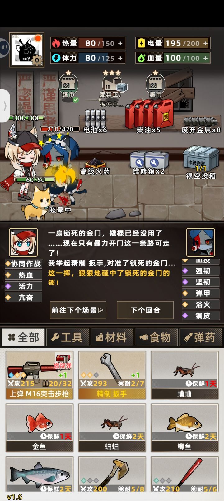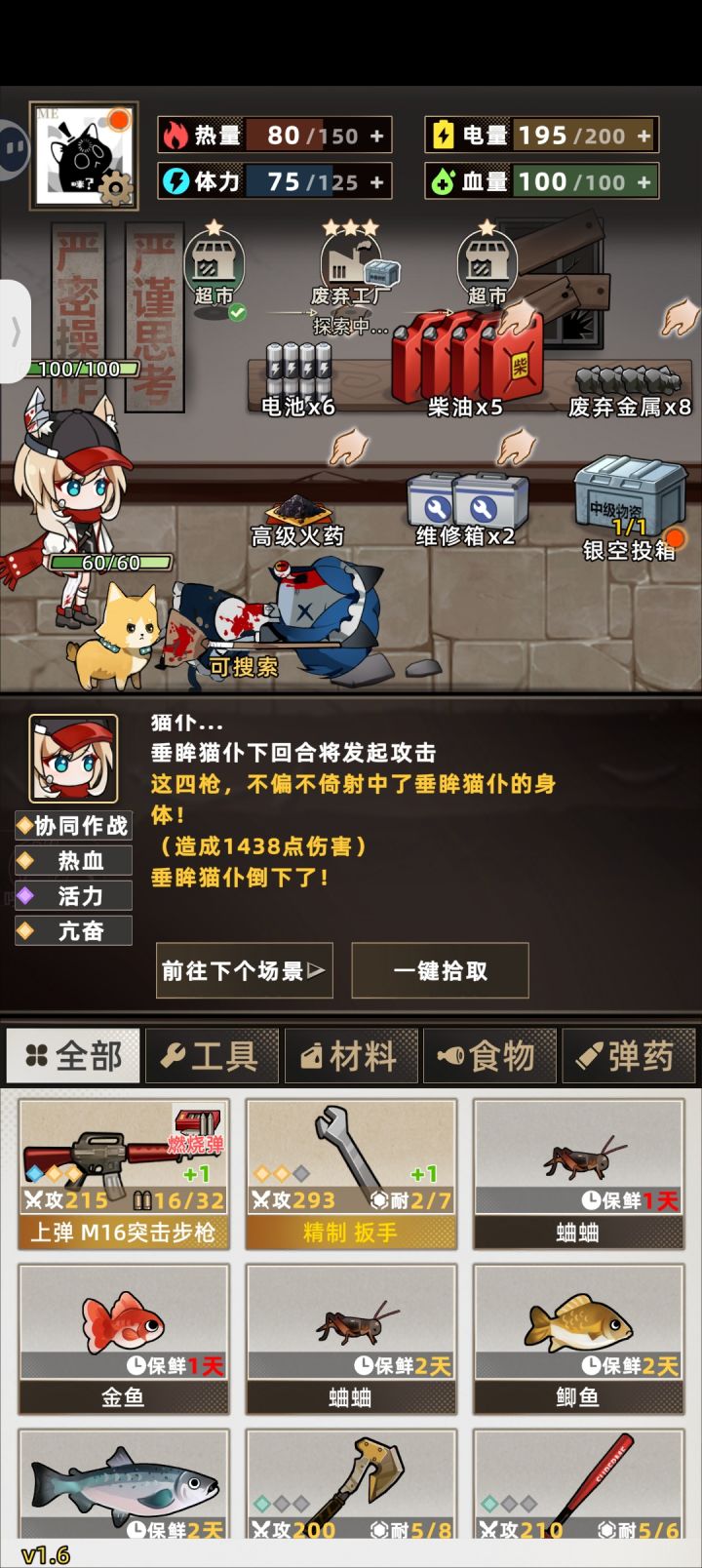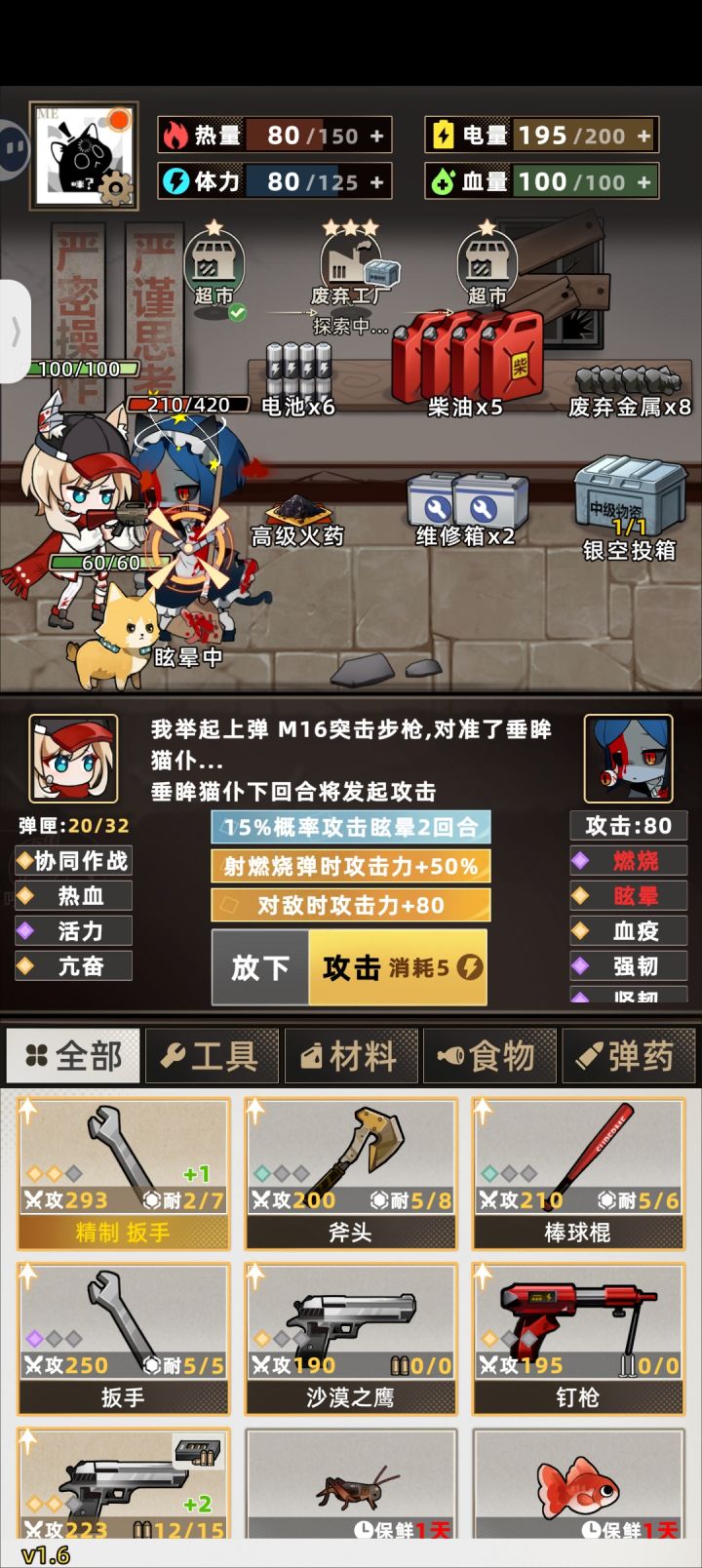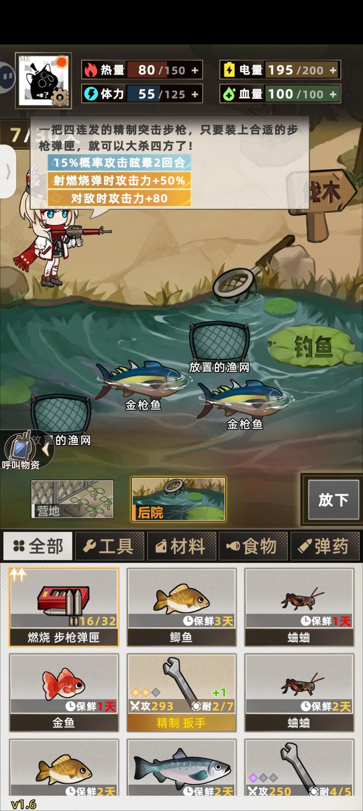 开局可以刷空投和手枪词条,空投以金色胶囊为最佳,其余也能用,影响不算太大。手枪词条紫色【攻击力+30】和攻击百分比都可以,有金色的更舒服。第一天,第一件事,到后院砍两块木头,和背包里的绳子合成渔网放上,是非常重要的资源点。第二件事,看广告拿到格外物资,这里推荐高级油必拿,因为当你的电量高于150时,体力上限+25,注意,这里的150是扣完第二天该扣的,还有150,也就是说尽量把自己的电量始终