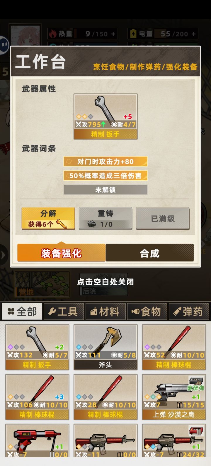 开局可以刷空投和手枪词条,空投以金色胶囊为最佳,其余也能用,影响不算太大。手枪词条紫色【攻击力+30】和攻击百分比都可以,有金色的更舒服。第一天,第一件事,到后院砍两块木头,和背包里的绳子合成渔网放上,是非常重要的资源点。第二件事,看广告拿到格外物资,这里推荐高级油必拿,因为当你的电量高于150时,体力上限+25,注意,这里的150是扣完第二天该扣的,还有150,也就是说尽量把自己的电量始终