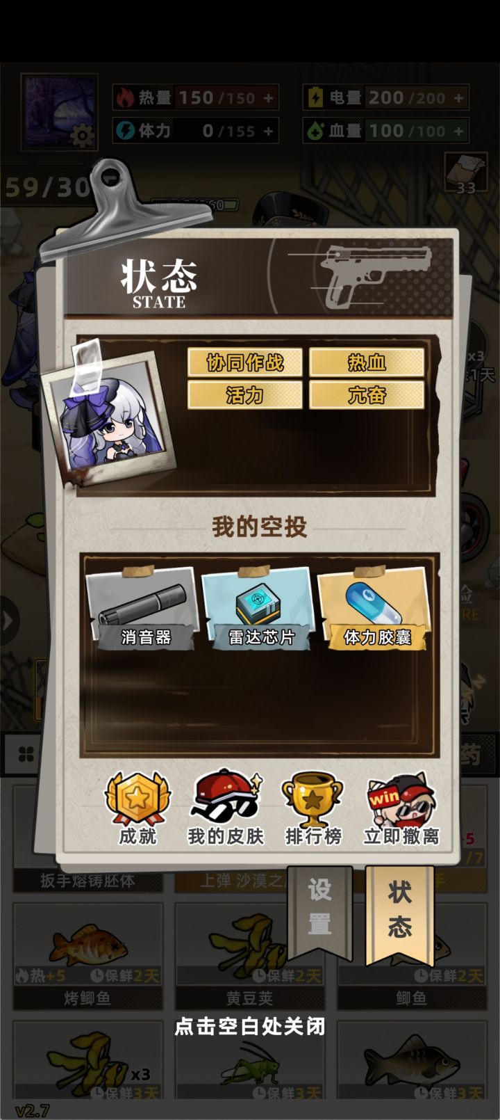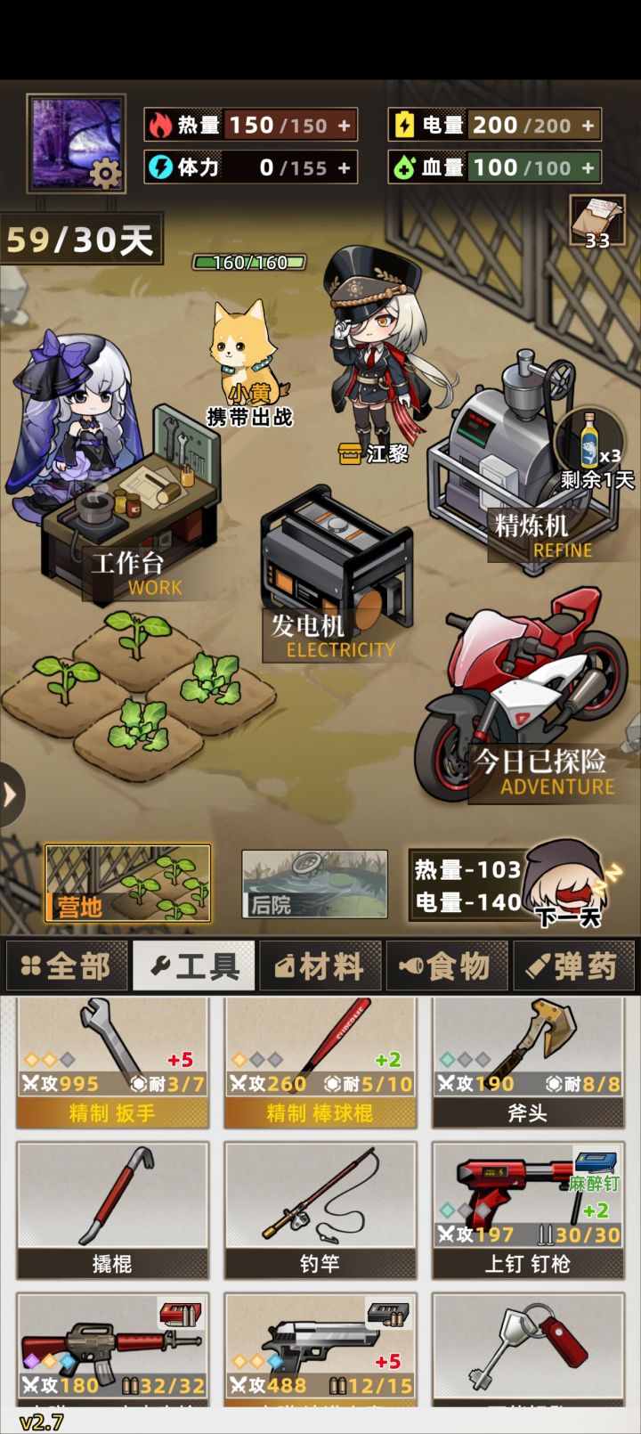 开局可以刷空投和手枪词条,空投以金色胶囊为最佳,其余也能用,影响不算太大。手枪词条紫色【攻击力+30】和攻击百分比都可以,有金色的更舒服。第一天,第一件事,到后院砍两块木头,和背包里的绳子合成渔网放上,是非常重要的资源点。第二件事,看广告拿到格外物资,这里推荐高级油必拿,因为当你的电量高于150时,体力上限+25,注意,这里的150是扣完第二天该扣的,还有150,也就是说尽量把自己的电量始终