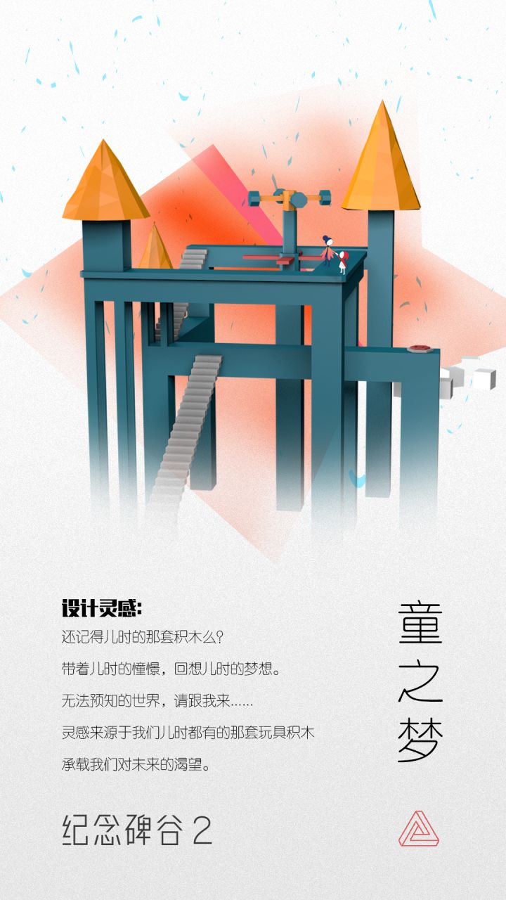 《纪念碑谷2》作为一款解密游戏,其中变化的场景让人耳目一新,而在游戏中的很多场景的设计灵感都是现实建筑,我们今天就《纪念碑谷2》第五章的场景与加州迪斯尼乐园吧。在之前的章节中,女儿一直是跟在萝尔身后的,我们操控的也一直是萝尔。萝尔去触发机关,去寻找出路,只有少部分时候,会利用女儿跟随萝尔的特点来触发一些机关。而第五章与之前章节最大的不同在于,这一次我们操作的是女儿,而非萝尔。萝尔站在门前,等待