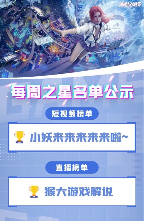 亲爱的终结战士们,大家期待的每周之星🌟排名出来啦!恭喜🎉🎉🎉(小妖来啦 抖音号:luokeke12138 )拿下本周视频榜第一名(猴大游戏解说 抖音号:134726747)拿下本周直播第一名,获得每周之星🌟称号!没有获得奖励的战士也不要气馁哦,进入官方主播招募群,大量官方福利🎁🎁🎁等着你!欢迎加入主播玩家QQ群:950782269