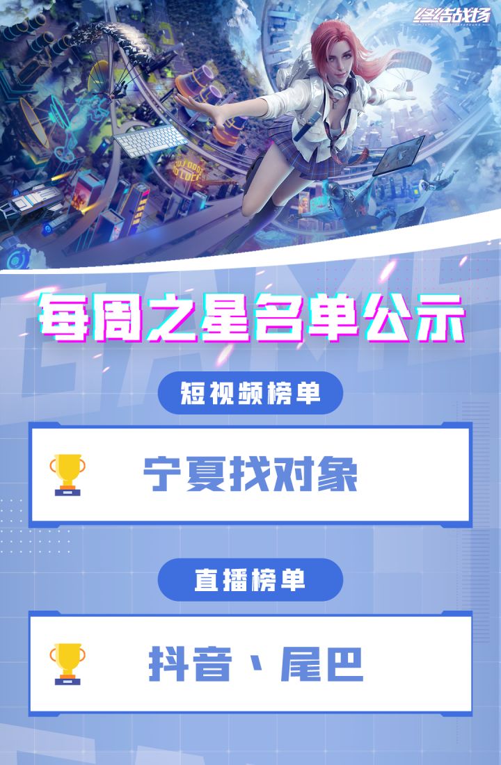 亲爱的终结战士们,大家期待的每周之星排名出来啦!恭喜以下两位主播获得每周之星称号!本周视频榜第一名:(宁夏找对象 抖音号:dyjm54da72cu )本周直播榜第一名:(抖音、尾巴 抖音号:dyyow9oli6wy)没有获得奖励的战士也不要气馁哦,欢迎加入官方主播招募群成为主播,大量官方福利等着你!下个每周之星就是你!!!欢迎加入主播玩家QQ群:950782269