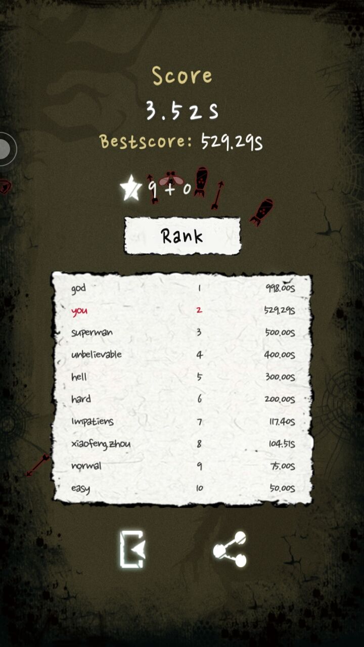 我觉得最气人的是那个飞镖,到现在也不知道是什么预兆,最安全的是左上角(注意蜘蛛)其次是右上角(注意飞镖),下面不安全因为有ufo(虽然预兆时间长但是面积很大如果被长墙困住就gg了所以尽量在上面)和蜘蛛(右下角秒杀),尽量避免在角落躲避除非无路可走因为角落被背后捅刀也挺伤,吃到片消威胁物的星星或者复婚之后趁无敌时间挑了空心星星,抢好星星,进无敌圈,出现天空之城钥匙如果一血不要冲动,钥匙星星摆在面前自己却吃不到浪费那么多星星很闹心,玩久熟悉各种威胁就能存活长一些,这个时间也不很长毕竟上面还有个上帝千秒评级,欢迎大神来喷我~zZ