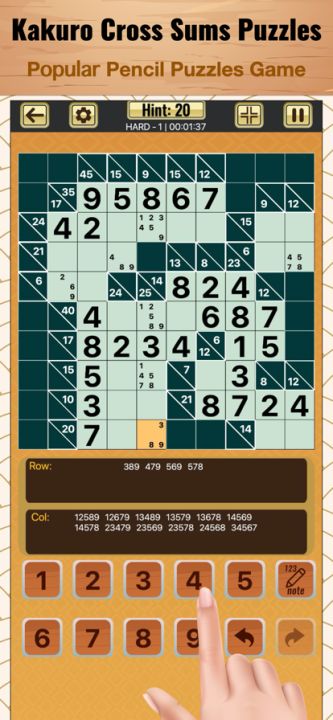 KAKURO - Cross Sums Puzzles is the popular pencil puzzles, It is also called Number Crossword Puzzle Game. The aim is to insert a digit from 1-9 inclusive into each cell such that the sum of the numbers in each entry matches the clue associated with ...