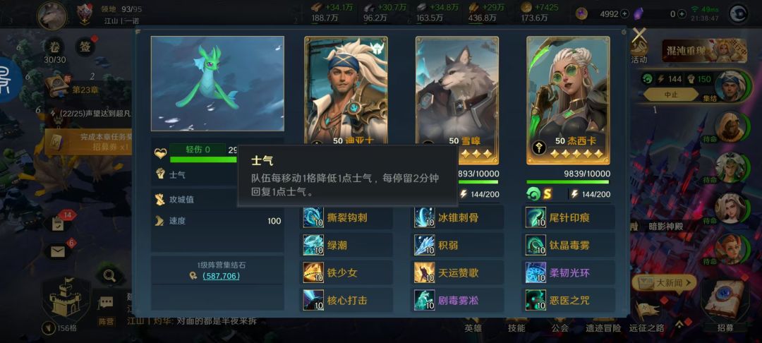 6.打地有士气系统,部队距离要打的资源地越远你的士气越低,士气越低伤害也就越低,所以前期尽量别打太远的资源地 7.关于”置换“,置换可以交换双方英雄等级和体力,但是体力会继承最低一方英雄的体力,前期阵容定好后就不要乱换了。 8.前期开荒你如果不知道用什么阵容,你可以从聊天-开荒里面看其他人战报,你有哪一队就去用,如果没有橙卡那就用紫卡先代替也能用 9.游戏内一共有4种元素,水、火、风、土,4个元素