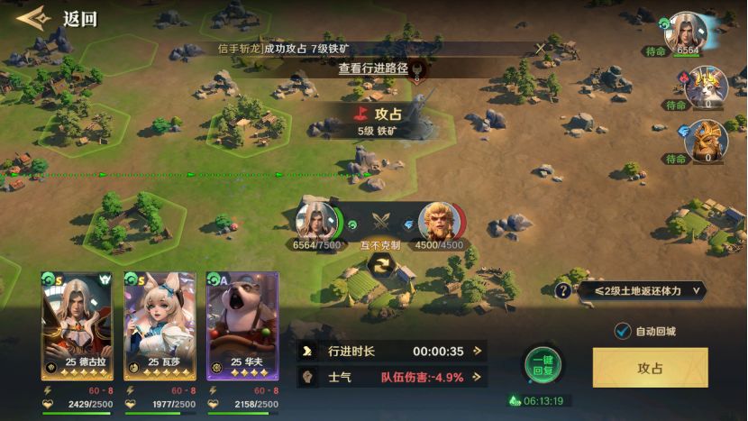 打地流程顺序 1.队伍推荐首选德古拉,其他队伍效率都不如这个队伍(20级以后换宙斯队) 2. 直接一直开星地块,2-3-4-5级地,一直撞,不要浪费时间打其他地。因为前期就是拿经验,重伤了等时间到了在上即可。撞完开星地全部到五,是15-16级,并打遗迹冒险关卡(队伍出门攻占的时间 直接拿一队能撞多高撞多高,获取更多的经验) 3. 3.15-16级找比较外面简单的6,重伤就撞2次。但是一般高战队伍可