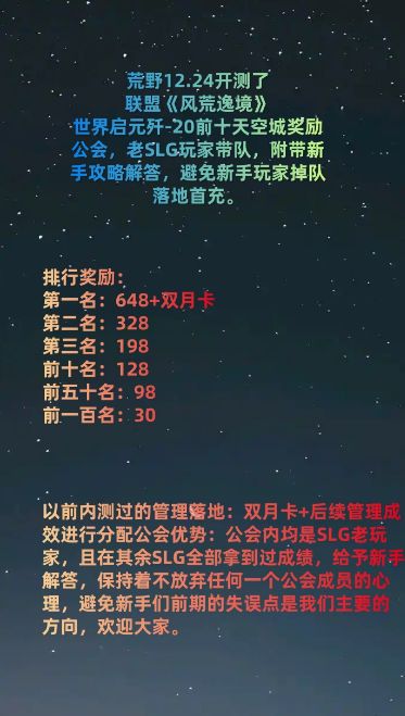 #荒野国度 荒野12.24开测了 世界启元歼-20前十天空城奖励公会,老SLG玩家带队,附带新手攻略解答,避免新手玩家掉队,落地首充。