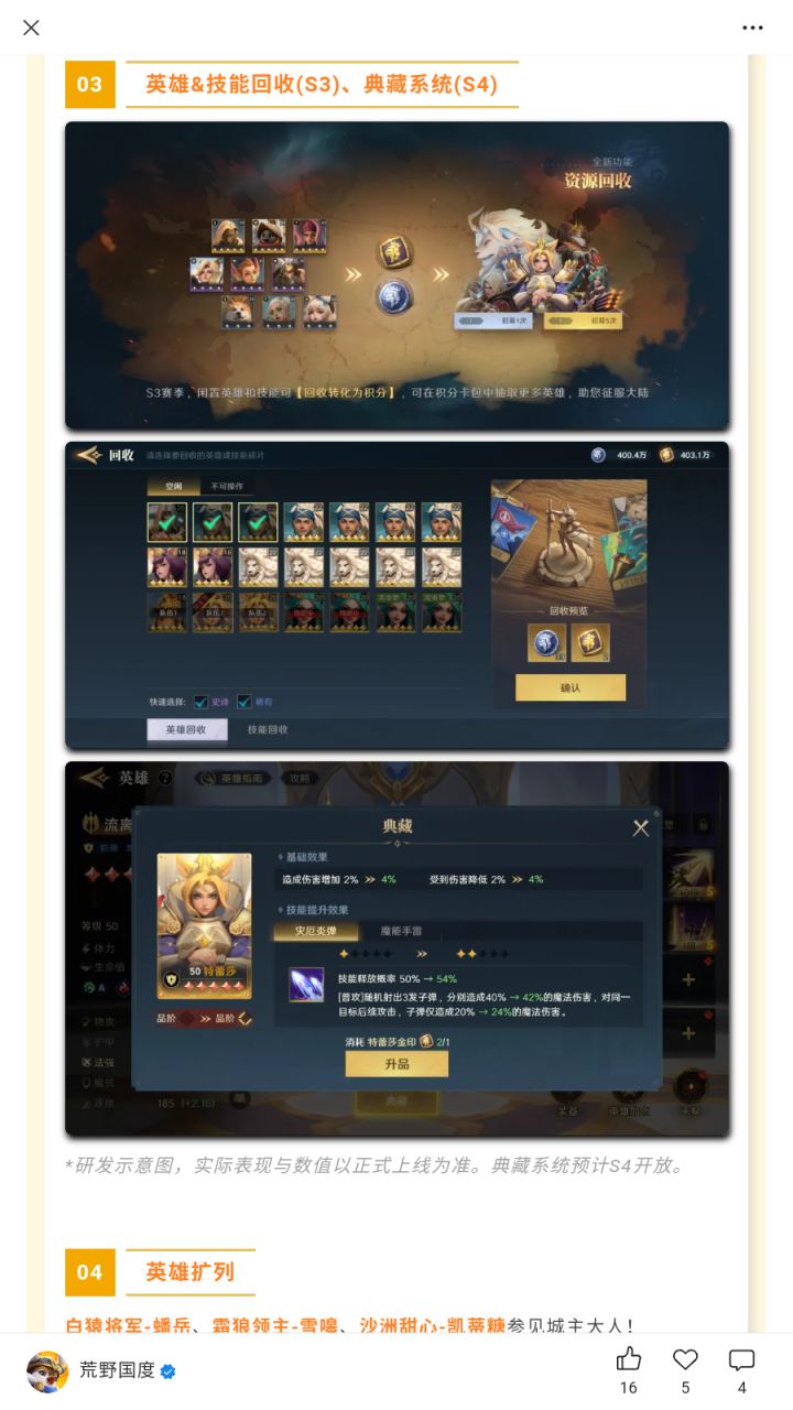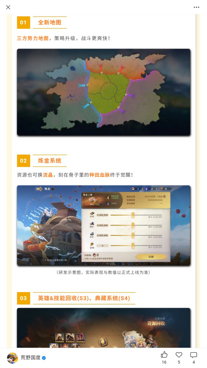 昨天共众号跟新的,S3很快了一、地图是三方争锋 熟悉的味道来了(这种地图要么一打二要么二打一,看谁军费多吸纳的人多了)这游戏人员流失真的很大,其他区不知道什么情况,上个赛季的大佬一个没见动过了,感觉下个赛季就是双方对抗了人都跑没了全是。二、炼金系统 资源换流晶(老板大气,混几个赛季种田抽卡崛起)三、英雄&技能回收 这个不用多说,多余的英雄和技能都可以分解积分,可以在积分卡包抽奖(希望跟