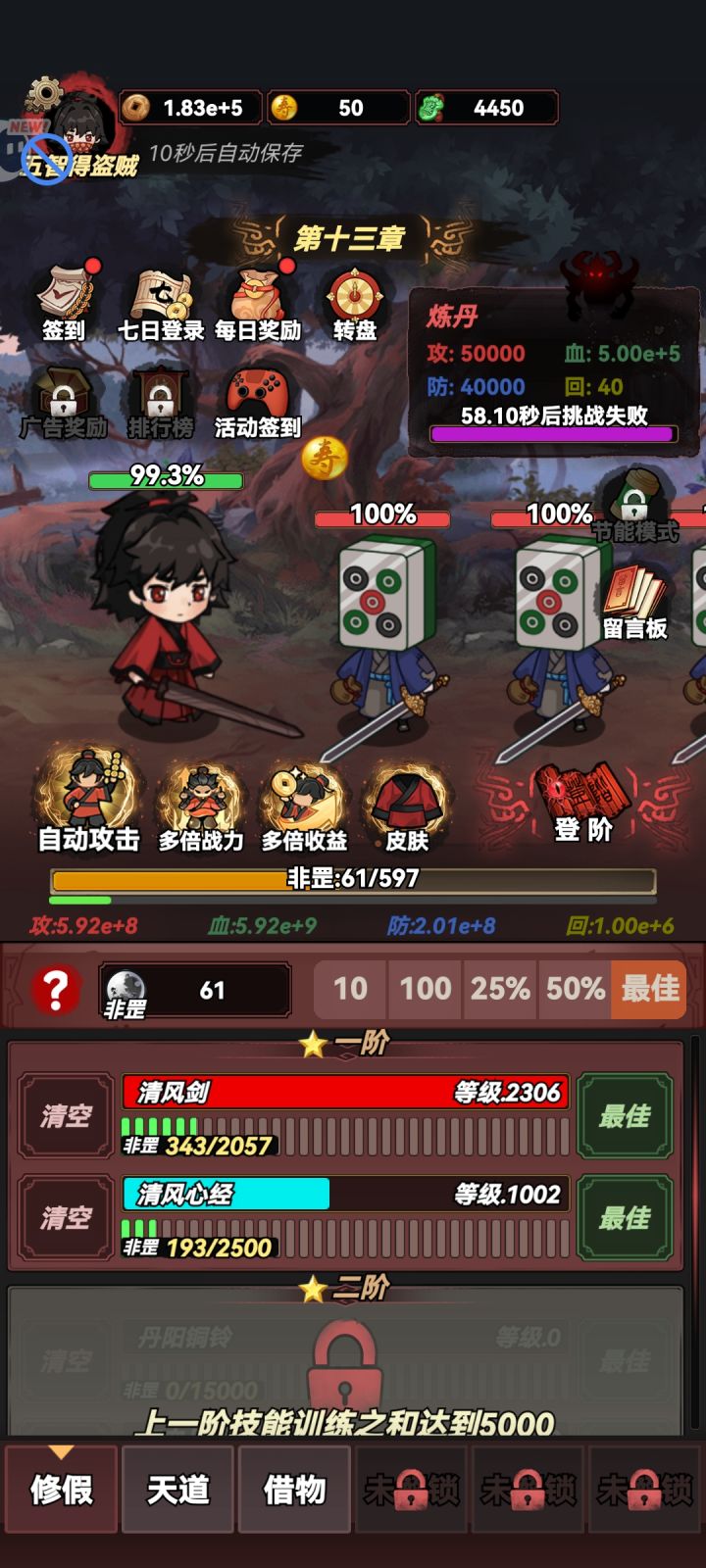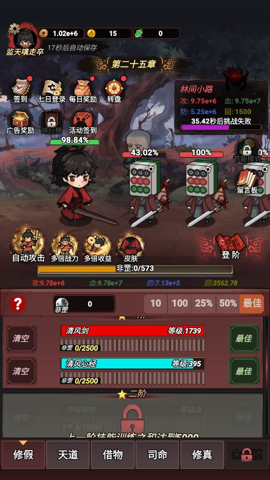 1.进游戏刷个红色天赋不刷也行影响不大2.优先主页自动战斗广告升级(每天广告限次30次)这个是永久自动战斗,其次是副本白玉京十倍奖励领取,给监天司里的铜币百分比拉满3.阳寿丹优先非罡上限、速度4.技能非罡拉满(登阶之后占用非罡就少了,点击技能可以查看登阶后非罡占用数量)5.修真想修就修(前期烧钱费时间,卡关登阶修真,登阶时间没到就修真,修真钱不够就登阶)6.挑战首领刷关,打不过就登阶,直
