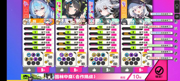 这俩打普通困难都是可以单人乱杀的程度,然后打困难和疯狂,忍者带上篮海晴和少主就能脚踹疯狂了,邦尼更是有自己的小团体,有人组就打疯狂,没人就在困难里面当皇帝,太舒服了🥰🥰