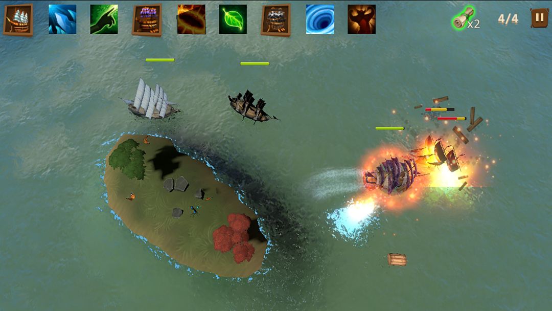 三艘战船同时上阵,二十多个技能,依靠策略走位的多英雄即时战略战斗,利用各种各样的技能搭配,不同类型武器的选择,挑战自己的极限能力。