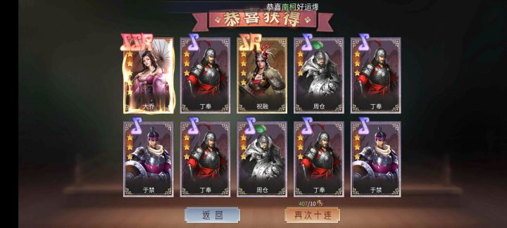 明人不说暗话,我就是来晒卡的,玩了两小时,福利超好!抽卡爆率也高,非洲人的我终于偷渡到欧洲了,特此留念。搭配什么的我就不说了,看谁顺眼把资源全倾斜就对了,更何况是三国题材的,不看攻略都能上岸。游戏虽好,大家可不要太贪玩哦。咻咻咻~装完逼就跑