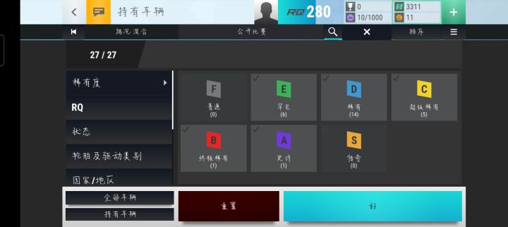 选车先看轮胎和底盘 新手教程会教你看底盘 分高中低 低底盘不能跑城市和一部分越野图 需要底盘的图都会标注一个小三角轮胎有五种油路这五种轮胎都一样 就是纯比数据然后雨天是标准最好 其次全地形 大于性能 大于越野 大于光头其余越野路面是越野最好 大于全地形 大于标准 大于性能 大于光头然后雨天和越野是四驱大于后驱大于前驱雨天同数据两驱标胎要大于四驱的性能胎然后就是对战 对战基本就是比数据