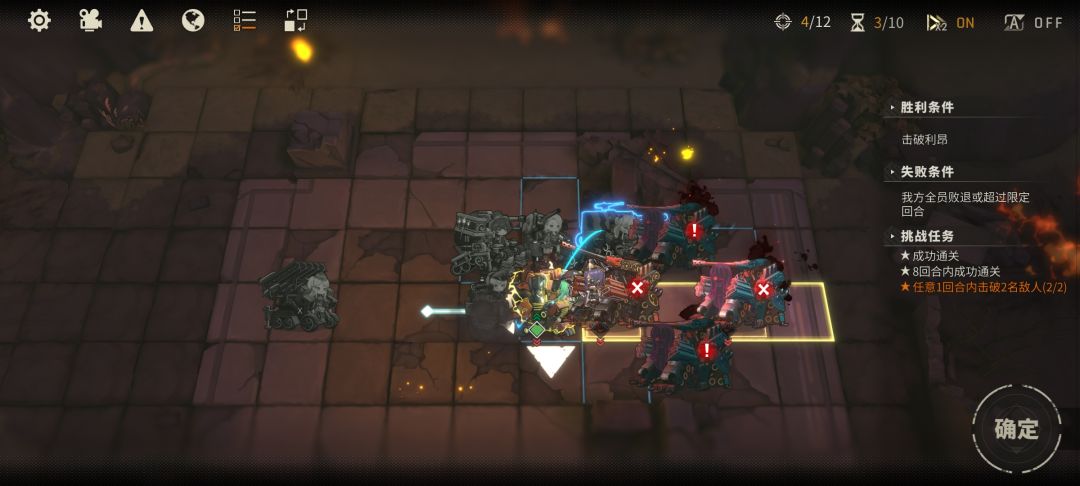 思路:前两回合全员只走两步慢慢推进上buff,尽量不打复制体。 第三回合给BOSS上联合攻势和侦察标志虎子平a打到60血上下,潘兴开大打BOSS触发无敌。 如果前面一个小怪都没打这个时候只会生成三层无敌,喀秋莎开大杀三个移除无敌,斐迪南收人头。