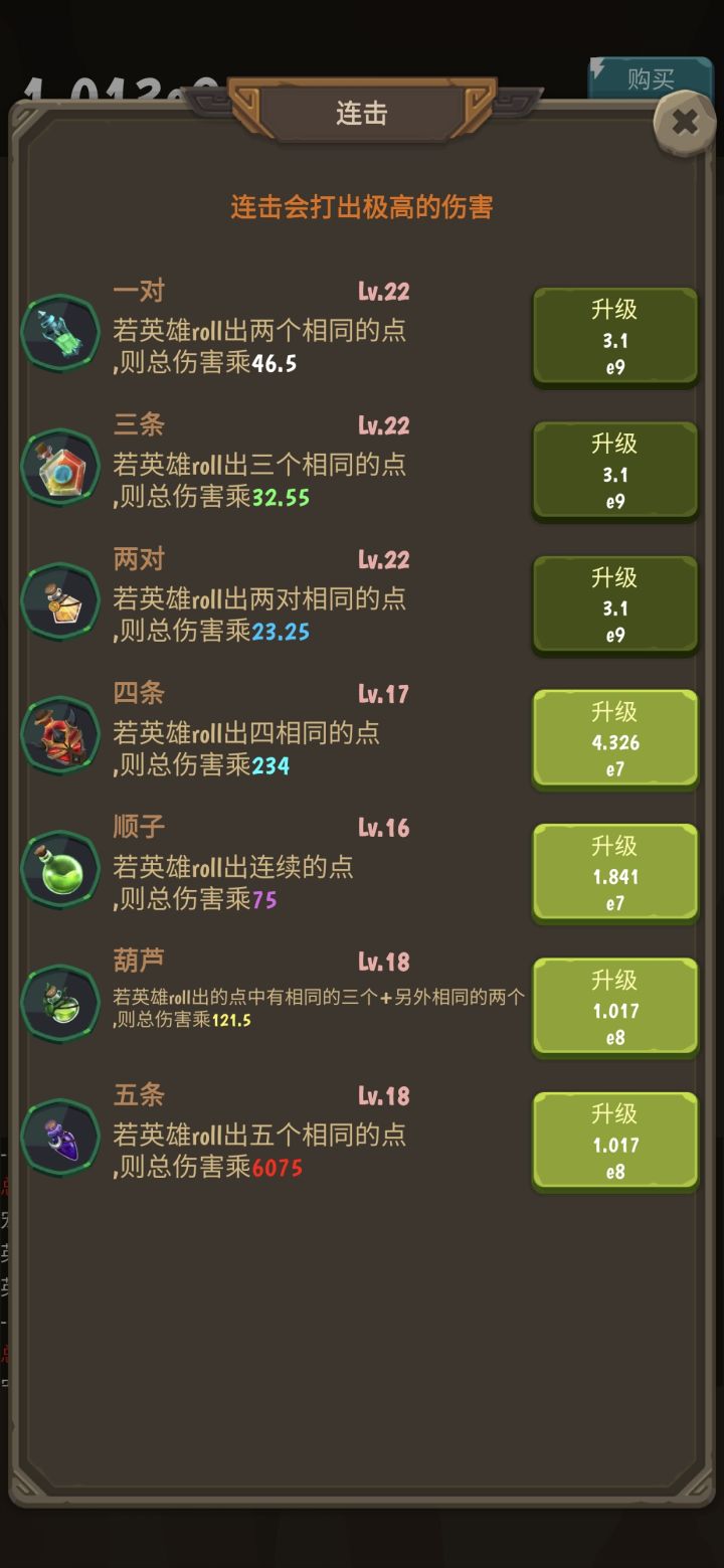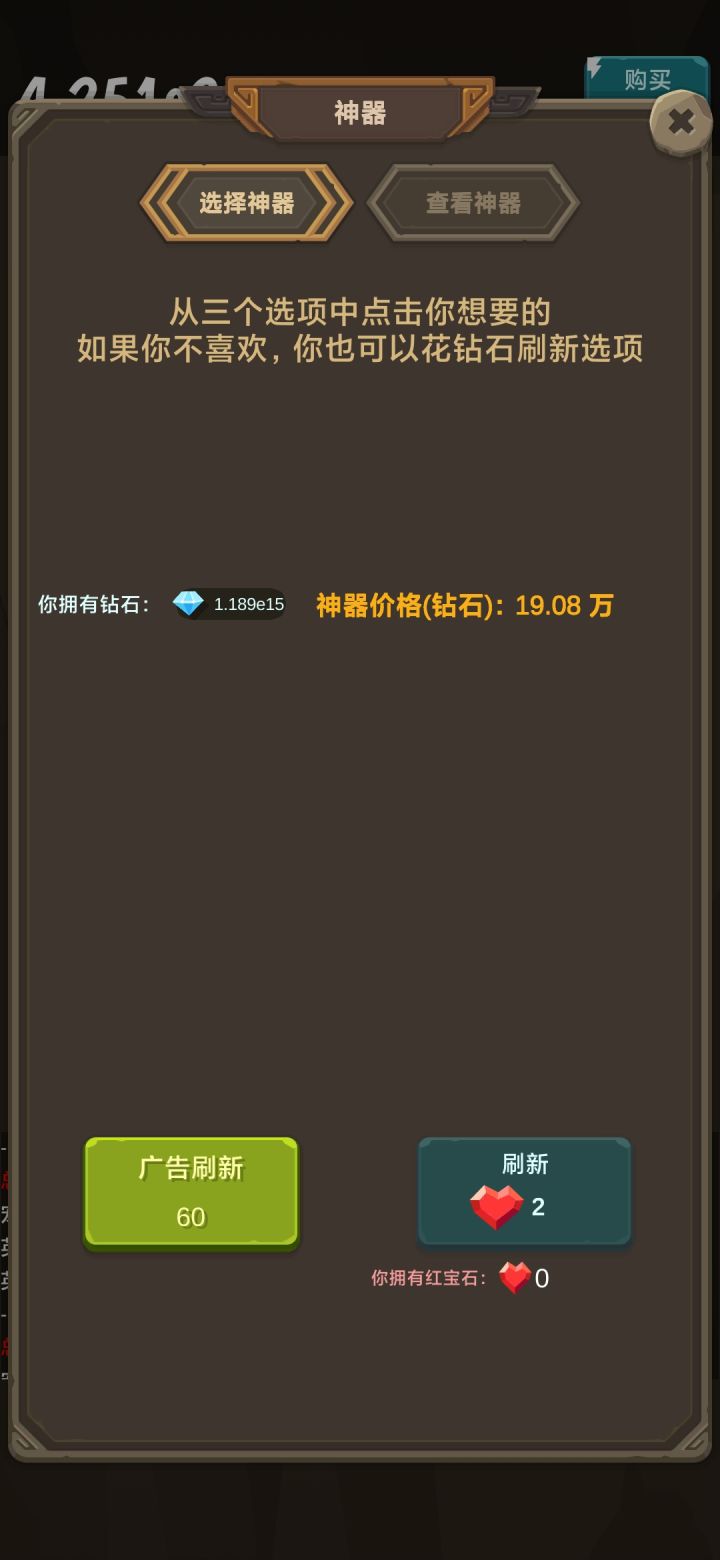 先说总结:这是个扔骰子套皮的类树型放置游戏,目前共4层级,我在第3个1.进游戏第一步要做的是用“xxx”兑换码拿100红石头,然后按部就班开始玩。2.第一个要注意的点是每单个英雄100级给一点点钻石,首先用红石头刷新,弄满神器1,就能得到16倍钻石收益,如果先点了别的再点神器1,不会后补钻石3.神器1满了之后随意,没有固定套路,给个小建议,4个神器9给1000倍伤害,还是很可观的,还有就是可