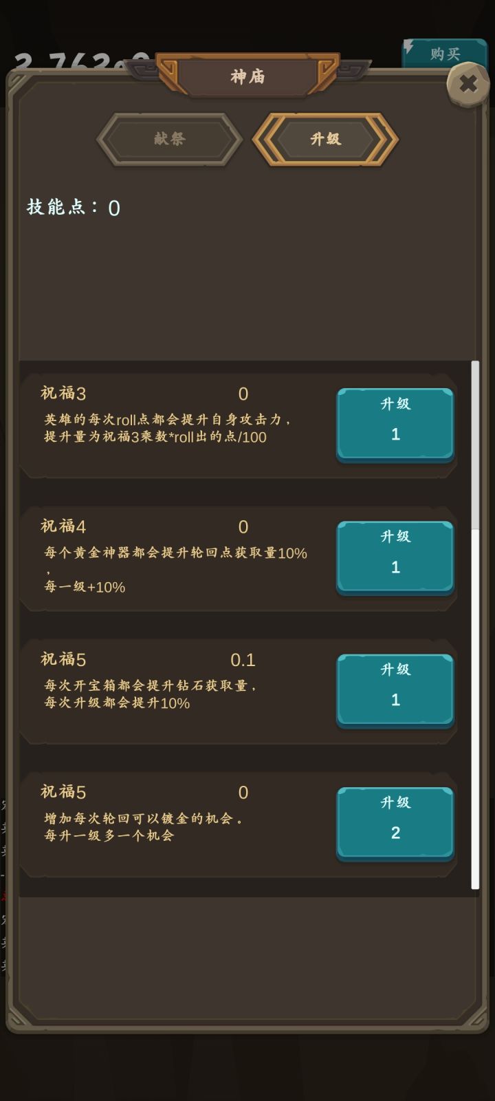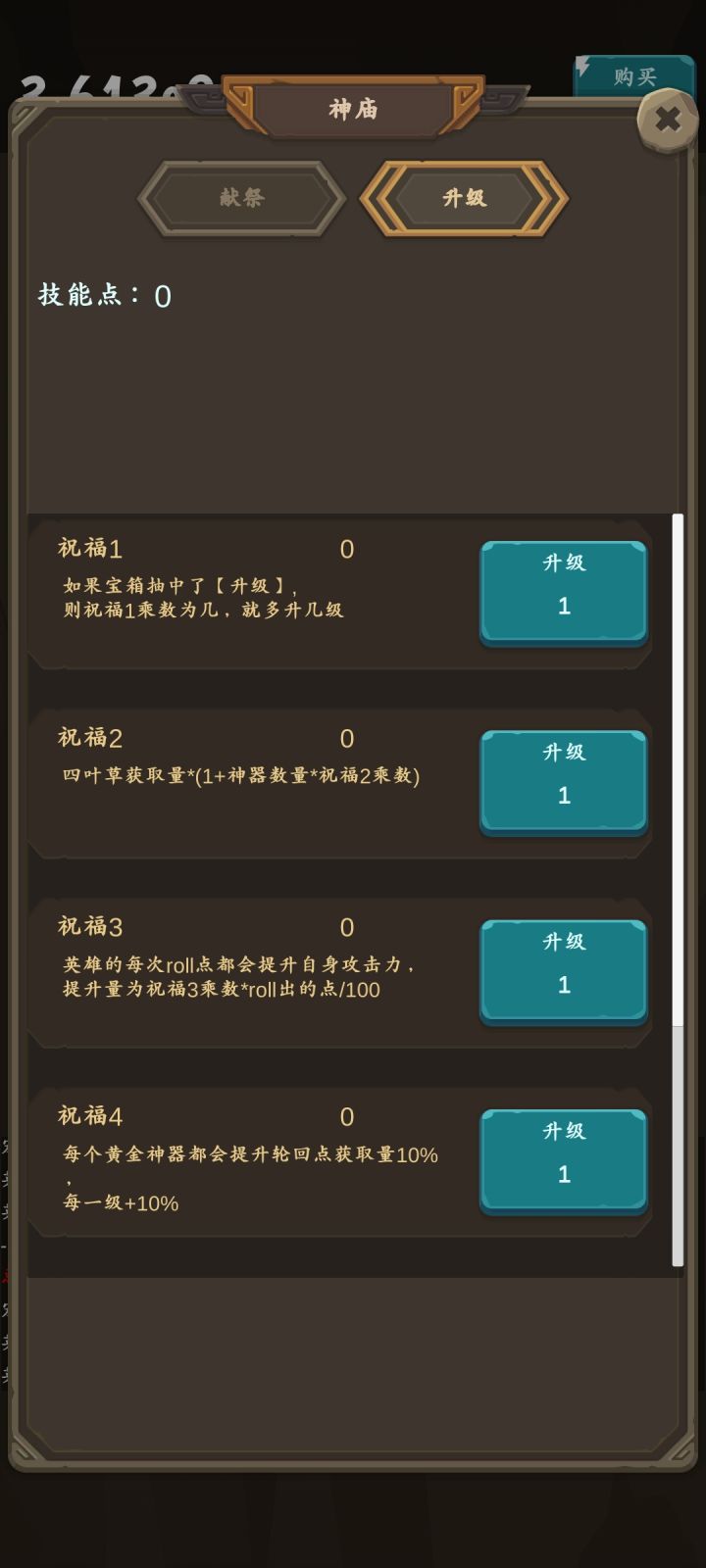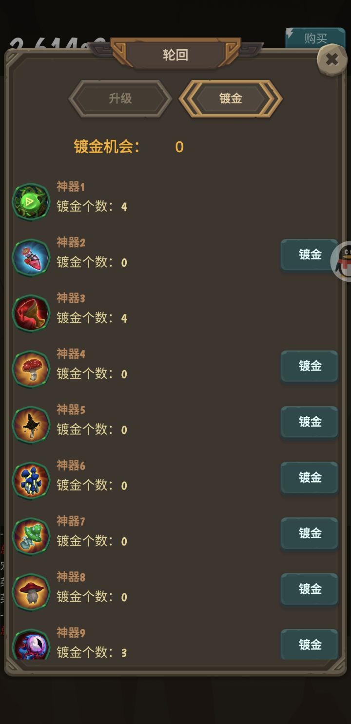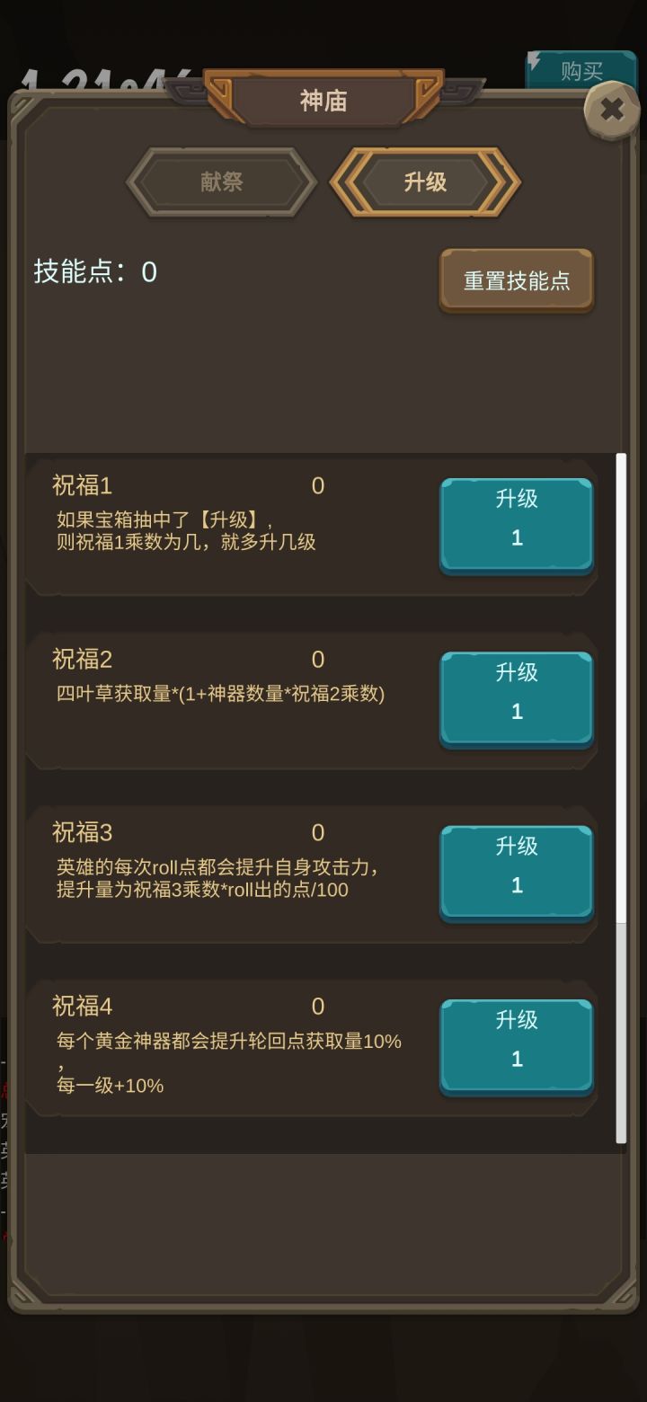 消耗所有镀金神器获得神庙点然后强化后面的选项看到强化后的0.1....好坑哇