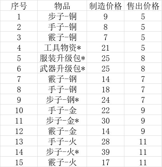 前言:第一次玩得时候几乎没用过商店,现在重新玩,发现某些制作物品实在是坑,自己造的成本比直接买都高。因此特地把坑货标注出来(*号),这种物品大家直接在商店买更便宜。遇到就别放过了,能搙羊毛的时候可不多。备注:1 购买价格为售出价格三倍2 制造价格是用材料售出价格统计计算3 为防河蟹,一律缩写4 装备和武器由于不清楚工具的价格,及受等级影响,因此偷懒不算了5 暴击伤害为1.5倍