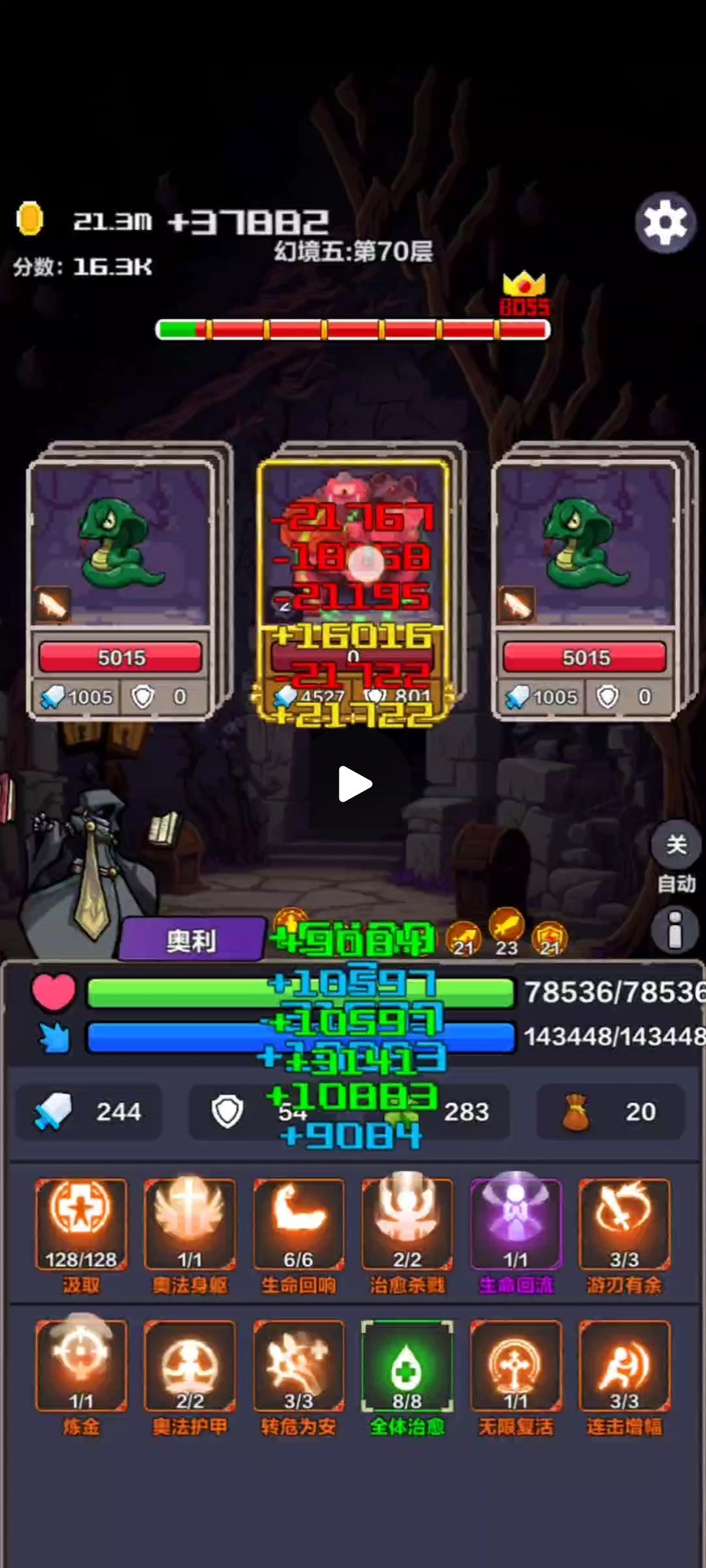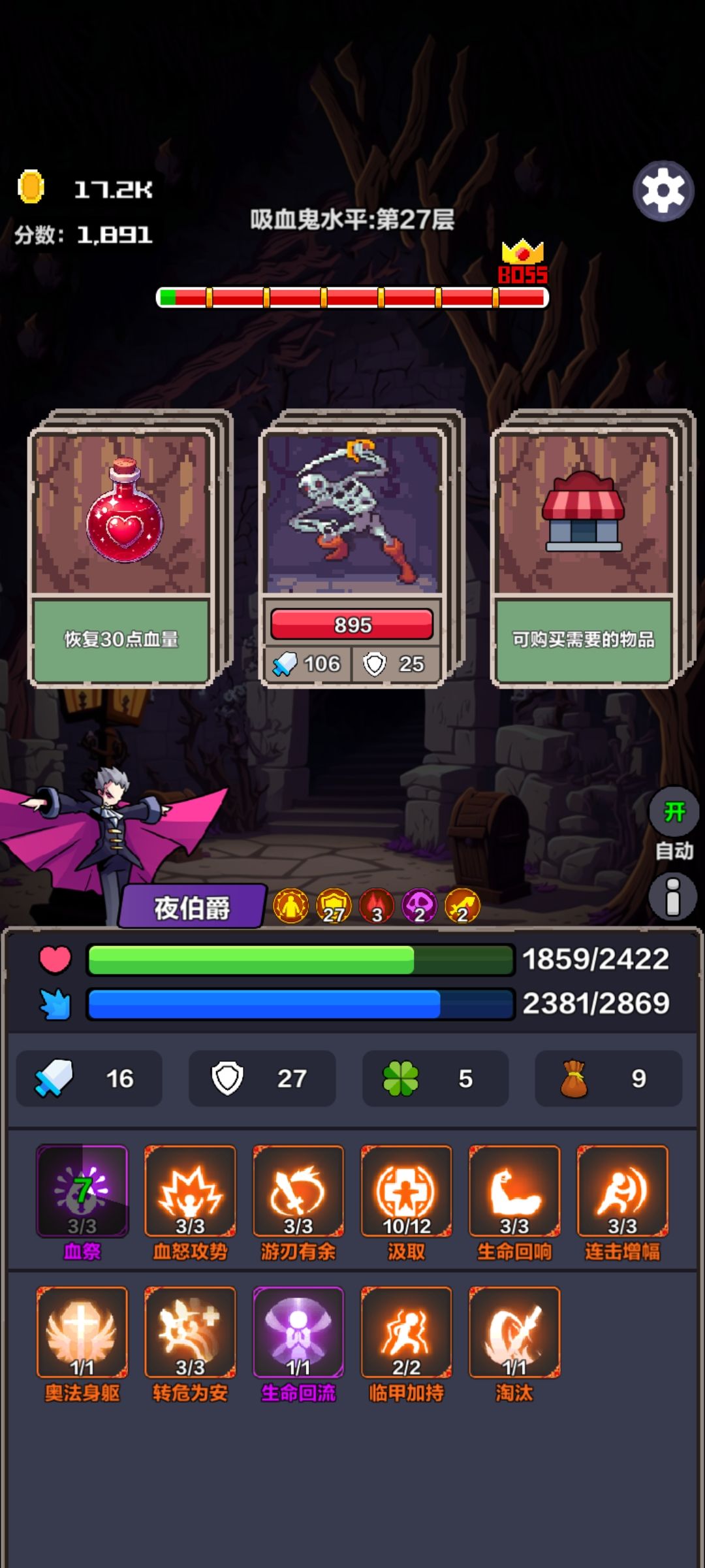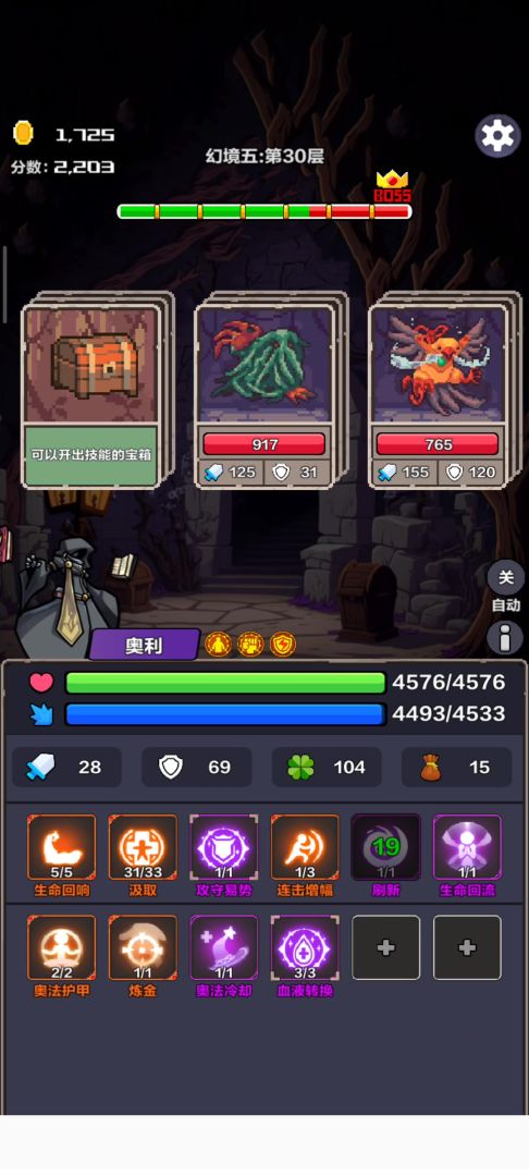 初始技能:汲取,生命回流,生命回响 前期稳血:回春术(3级回复最大生命30%),奥法护甲(优先2级),刷新(跳过BOSS和未知区域),净化(解除中毒、诅咒、流血),治愈杀戮(回血4%) 中期:每60个怪出现提升技能上限,手速快连点三下确认,汲取、炼金优先升 选择:攻>防>幸运(影响技能上限出现概率)>掉落>蓝>血 后期:血蓝有一万左右,卖奥法护甲,带无限复活,献祭11%+血祭20%+噬血10%自杀