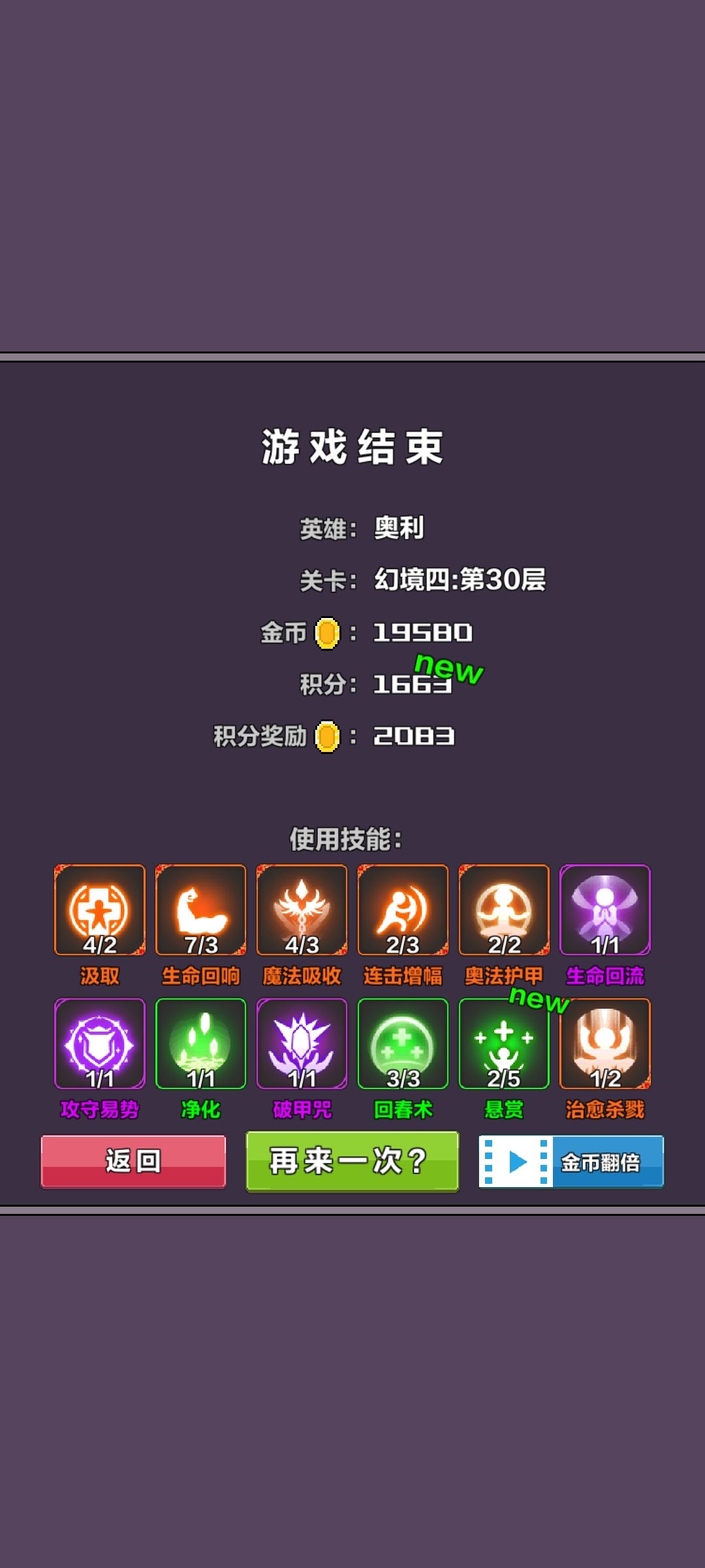 神技:刷新——无限规避,无限资源。 英雄选择:没有训练过力量的。必须足够废物,不是废物还不行。力量高了会死得太快。 开局技能选择:汲取,生命回响,刷新。 下本后,第一层随便打,遇到boss后就用【刷新】,前三层同样。因为打了boss后,野怪的功击成长会加快50%,到了第五层就扛不住了。 打完前三层,应该有足够的技能了。技能选择优先级: 生命回响升级; 生命回流,魔法吸收,转危为安; 攻守易势; 生