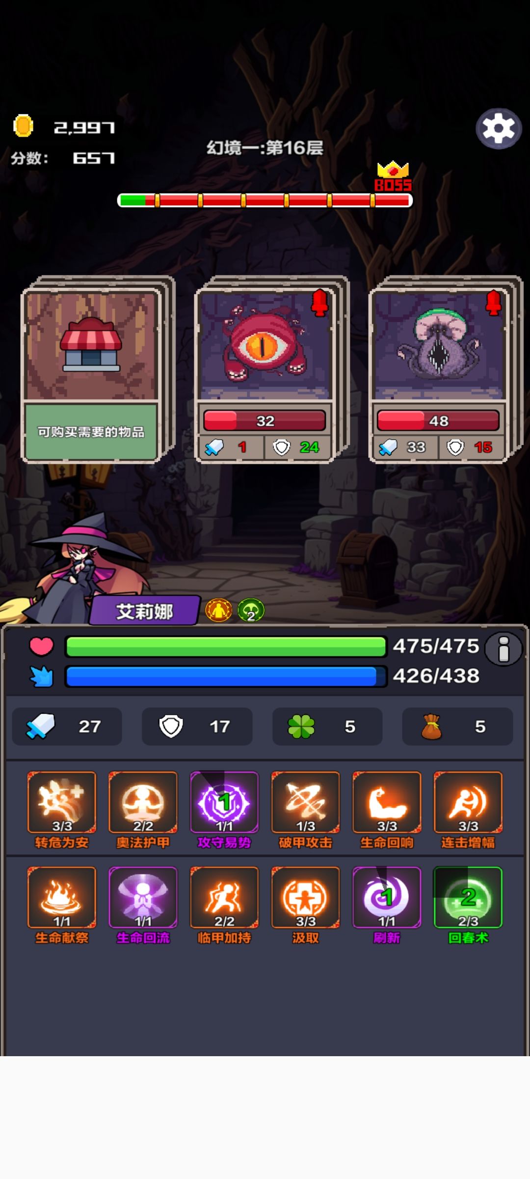核心思路:不打死怪不做事件就不会推进进度,如果只做升级上限的事件,就可以在低难度安全发育 初始技能:建议带汲取+生命回响+刷新,也可以自己组合一些绿色技能降低初始难度 第一目标:刷新每次耗蓝40点,初期属于耗蓝大户,因此第一目标是在蓝用完之前刷到回蓝技能,包括转危为安/生命回流/魔法吸收/转换等,保证刷新的持续性 第二目标:刷新本身有20回合cd,因此第二目标是刷到耗cd的技能,最好的是刷到吞噬,