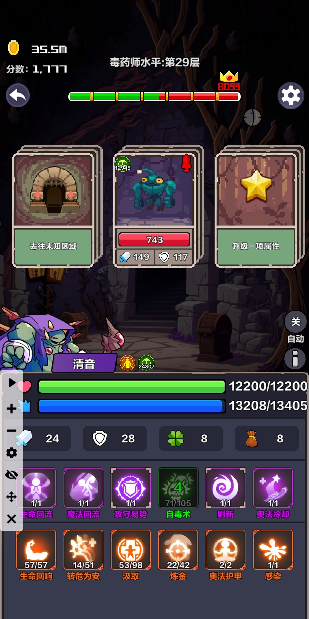 生存方面: 奥法护甲+生命回流+生命回响=无敌 如果BOSS攻击太高可以带攻守易势,BOSS防御不会太高,如果双高就带破甲攻击再攻守易势 如果BOSS会毒和流血的话带净化 BOSS会禁疗的话带折磨 输出方面: 留两只毒怪后,带上感染,制毒免疫毒伤害直接一会给给怪上几百层毒,a几下就死了 溢出伤害4000多,直接刷一万多金币