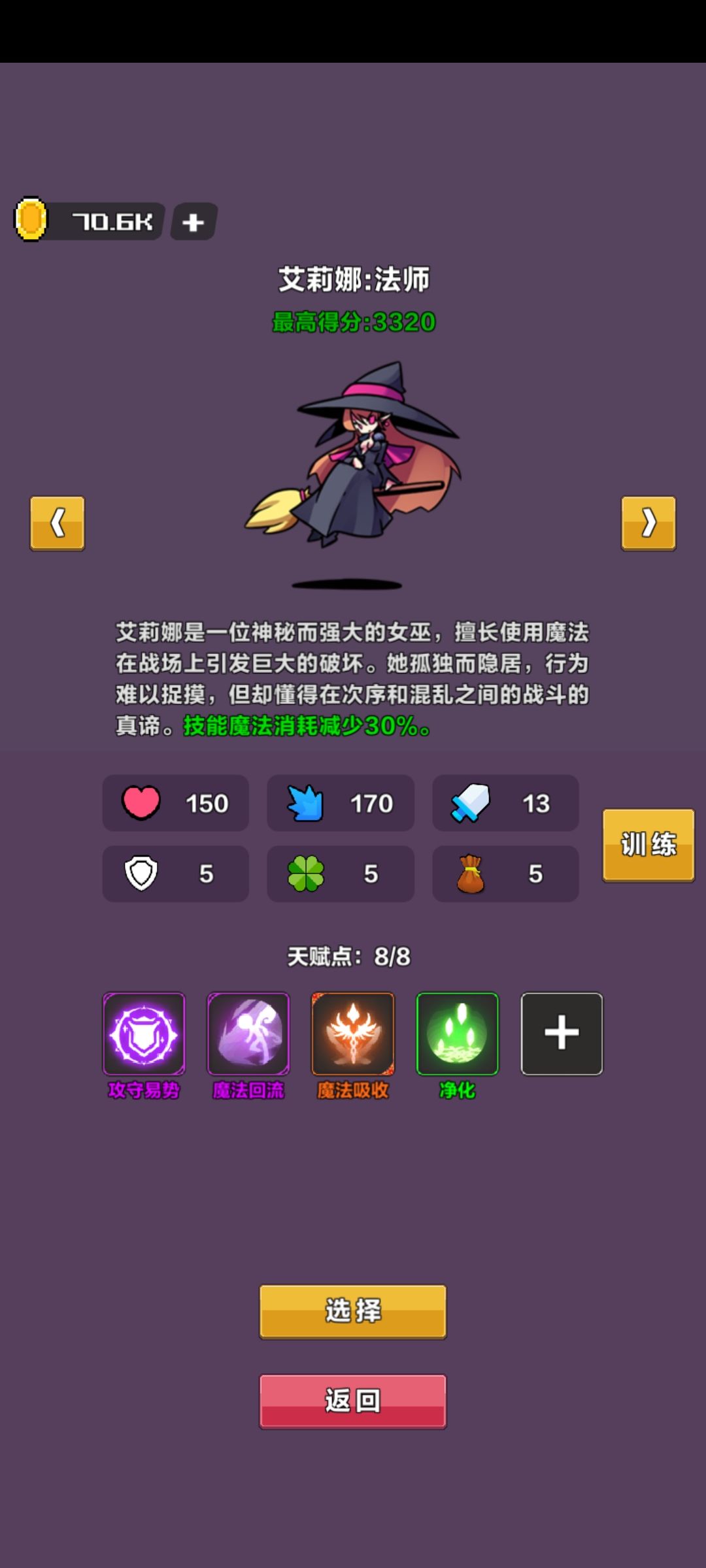 先拿上最超模的角色,看俩广告就送的戏法师。 随便刷几次把天赋点解锁了,500金币一点很便宜。 顺便解锁一下汲取和生命回响,前期出场带上这俩就够了,多出来2点天赋可以带个回春净化,这些都是能用挺久的。 前期优先把汲取提几级,撑一下属性,其他的技能选择上,看你缺啥按照下面的挑着升级。 回血最强的是生命回响,怕死就带个回春,回蓝就一个转危为安,缺伤害就靠连击增幅和破甲攻击,10层之前拿上攻守易势和折磨就