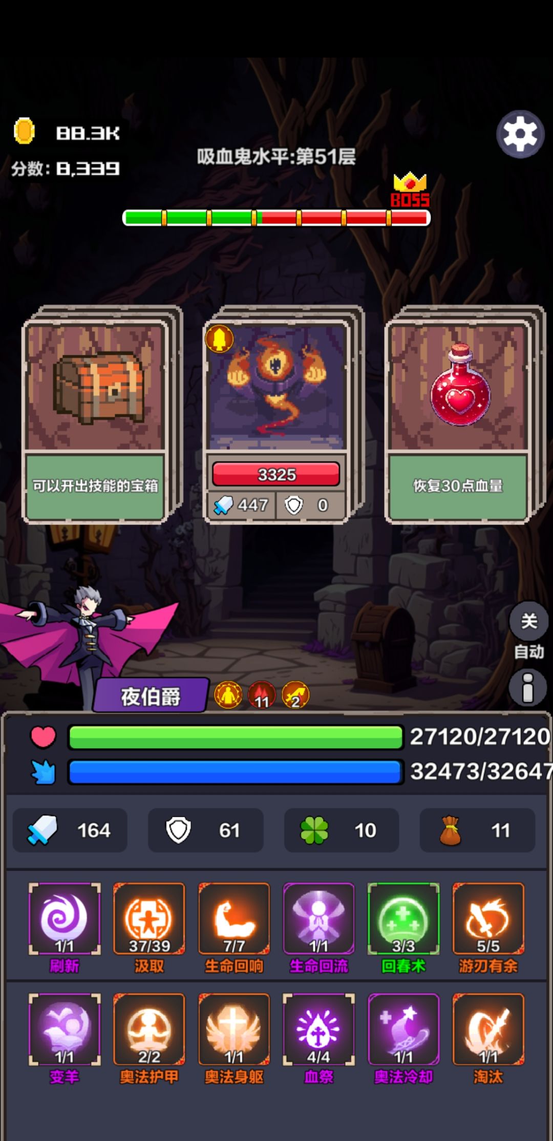 个人思路:吸血鬼 开局技能:汲取、生命回响、生命回流,(发育阶段及时补满上限) 初期技能: 游刃有余(增加攻击次数主要被动输出) 破甲(后期意义不大可以换个刷新) 淘汰(低血秒杀全场通用) 还有一个免第一回合攻击的有空格时可以作为过度技能 初期能力选择最优先攻击(初期主攻靠平A),然后是生命(初期续航) 中期技能: 魔法身躯(魔法值大于生命值时加攻击伤害很逆天的存在,爆发力极强) 转危为安(强化续