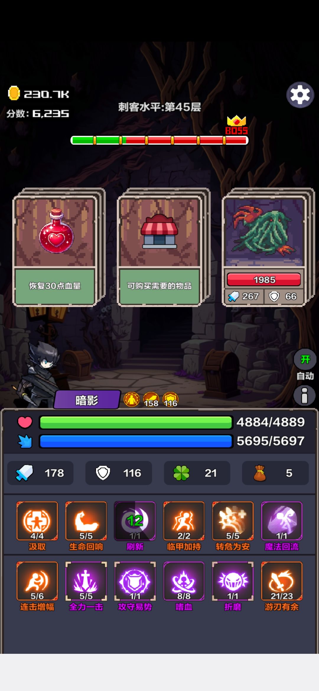 核心:自毒、感染、汲取叠buff,回春回血保命 辅助:前期用转危为安回蓝,后期转生命回响和生命回流回蓝 三层成型,然后越往后伤害越高,二十层已经可以做到一回合4000+伤害,两回合破万 所有怪都顶不住一个毒爆,如果不加出其不意小怪两回合一个,一回合叠毒一回合毒发,如果有施毒祝福一回合一个小怪