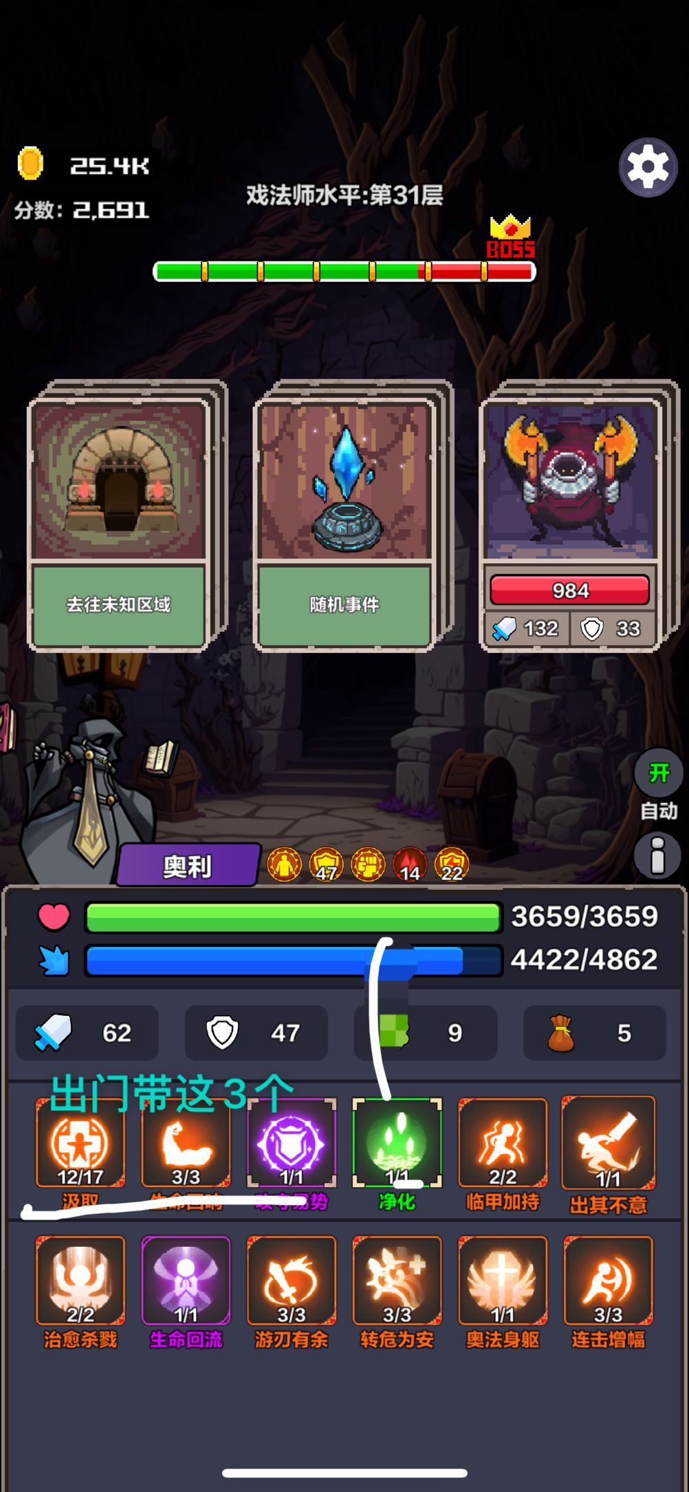 治愈和奥法冷却可以换成全体治愈+净化。我是前期没打出来,后期秒怪技能刷不出来了。小怪随便打,打boss前多按几次治愈叠buff,然后上折磨(必须),在然后就可以蹂躏它了。一路通关,无敌。 注1:汲取、奥法护甲、生命回流、生命回响、转危为安,初期最好就能凑齐。不然选其他乱七八糟的技能容易被打崩。 注2:技能升级前期优先汲取,后期优先生命回响。我是随便升的,其实都行 注3:打怪要一个个打,三个怪兽牌刷