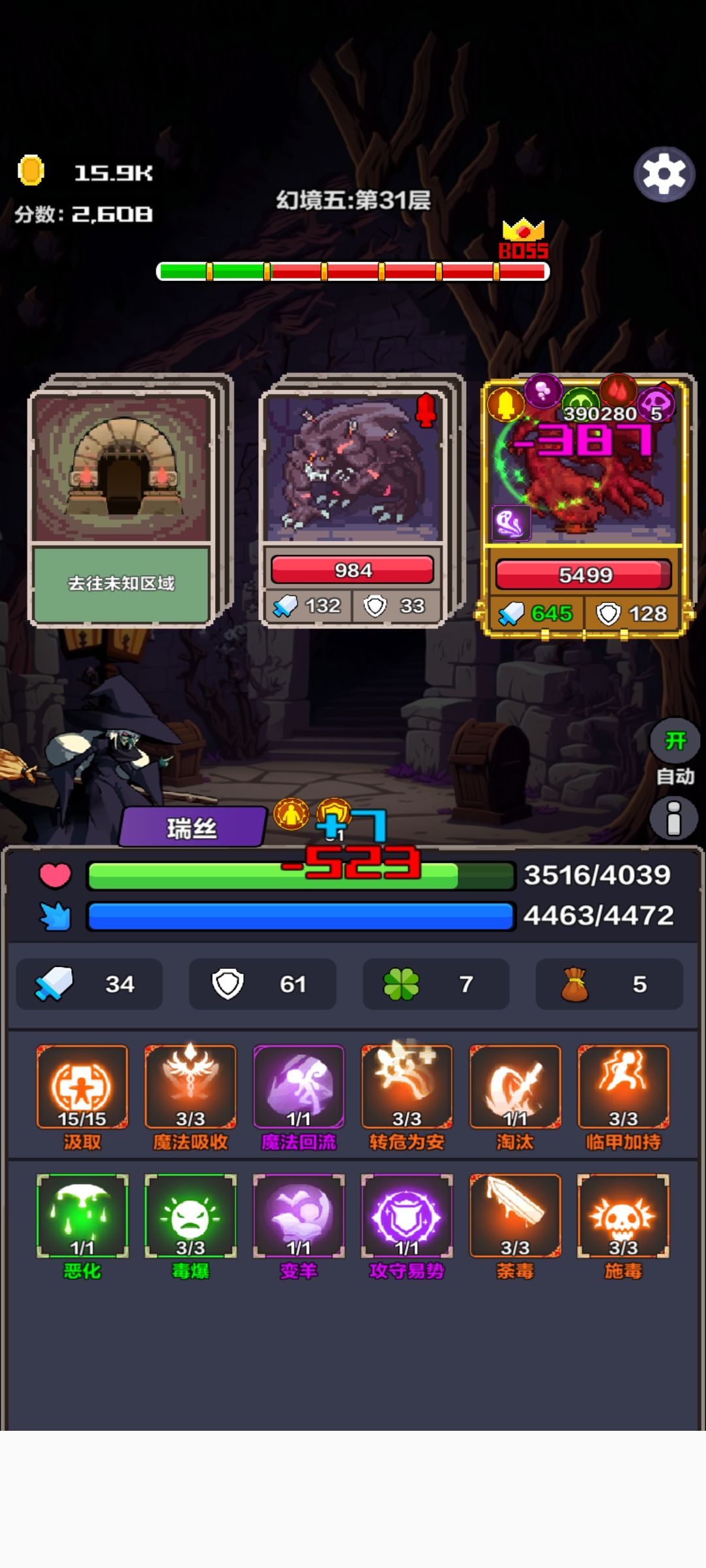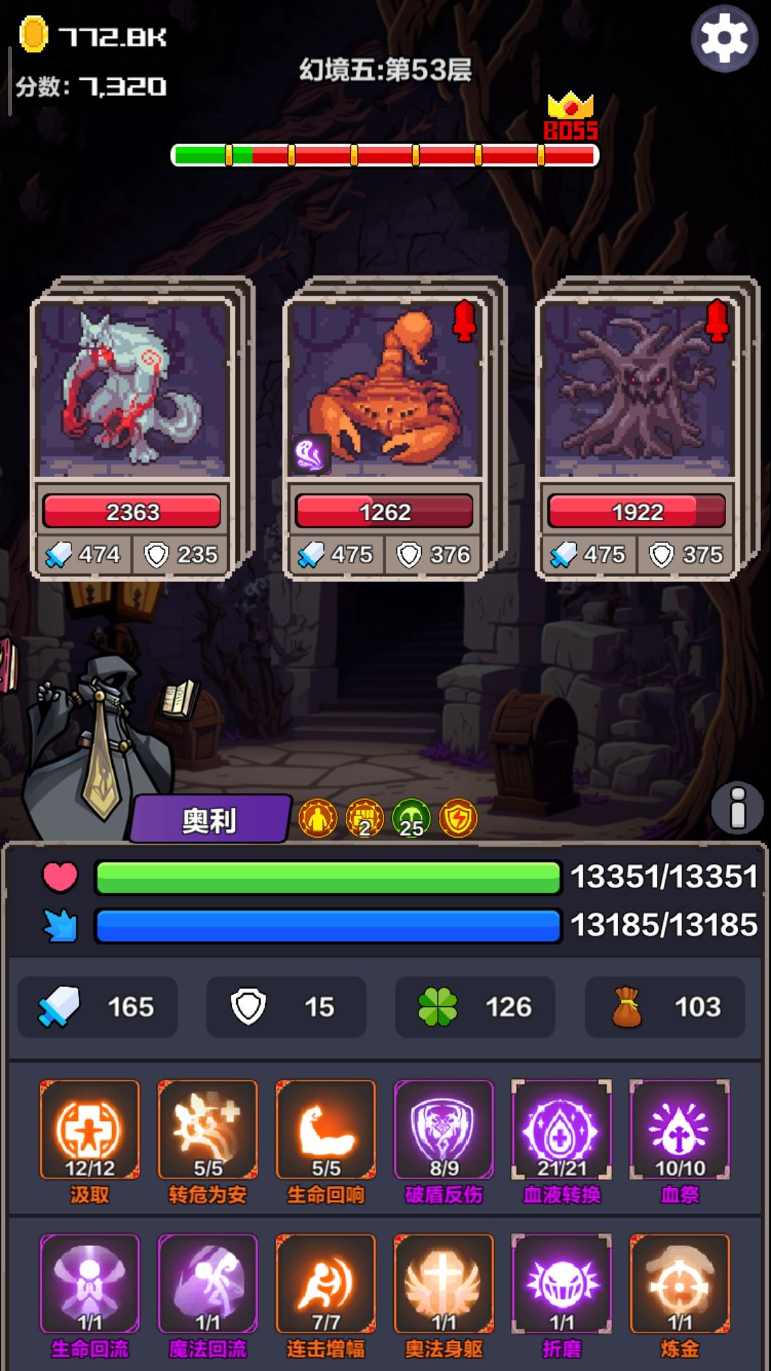 如题。游戏没啥深度,主升汲取,保命靠回血+回蓝+血转蓝+魔法护甲,攻击靠减甲+连击,前期应该需要净化过boss,后期靠刷新拿有益卡(感觉幸运跟掉率都没用),图书馆刷书想吐,懒得继续玩了。想打的快就属性拿攻击,还可以加上套毒。自己试组合,反正死不了。