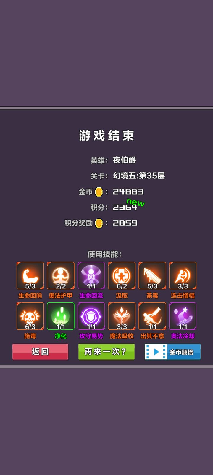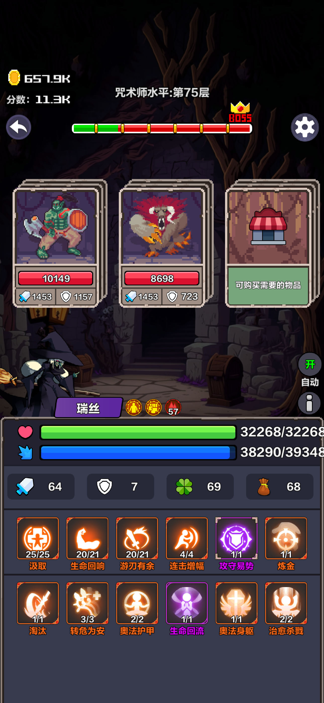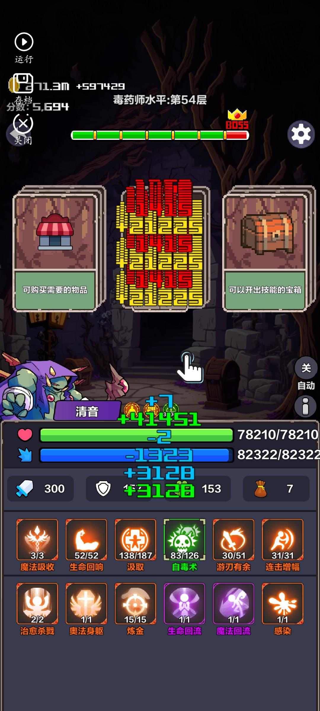 用毒师,自渎术+感染+炼金+汲取+生命回响+生命回流,先汲取和自渎有个十多二十层就够了,接着无脑把生命回响点上去这是百分比回血,初期需要个攻守易势,后面啥BOSS也挨不住毒,商店可以想咋刷就咋刷,只要自渎+汲取+感染+生命回响+生命回流,这五个不换,其他技能随便搭配都行,怪物成长永远跟不上,叠十万多的毒,怪物才不到一万的血量,金币没地方花,生命回响甚至能一下回一管血,有耐心能达到生命条200%以上