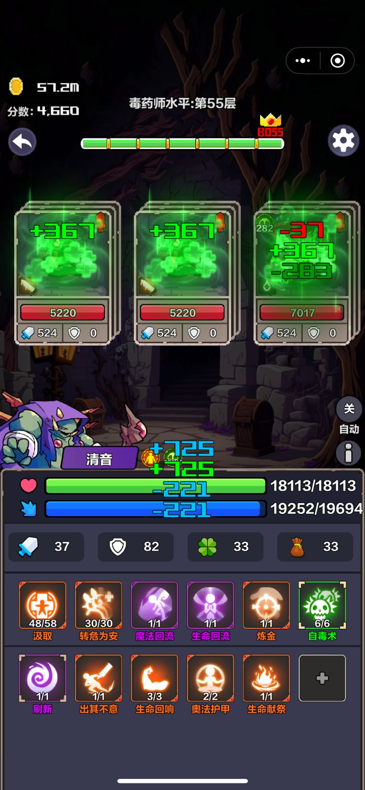 基本套路开局:1、汲取、刷新、魔法回流、回春2、汲取、生命回响、刷新我习惯用第一个,遇到技能商店直接看几次广告出转危为安升级,转危为安优先6级,配合升级汲取,永动机成型炼金一级,是因为可以小蛇叠毒,之后直接爆伤害爆钱(叠毒记得先把感染扔了,别给小蛇毒死) 高层保障,主要靠奥法护甲+刷新,有问题就重启大法,不是走神点了无法回血好几次,不会出事的没有刷新和感染,就没必要刷毒啦,靠毒爆