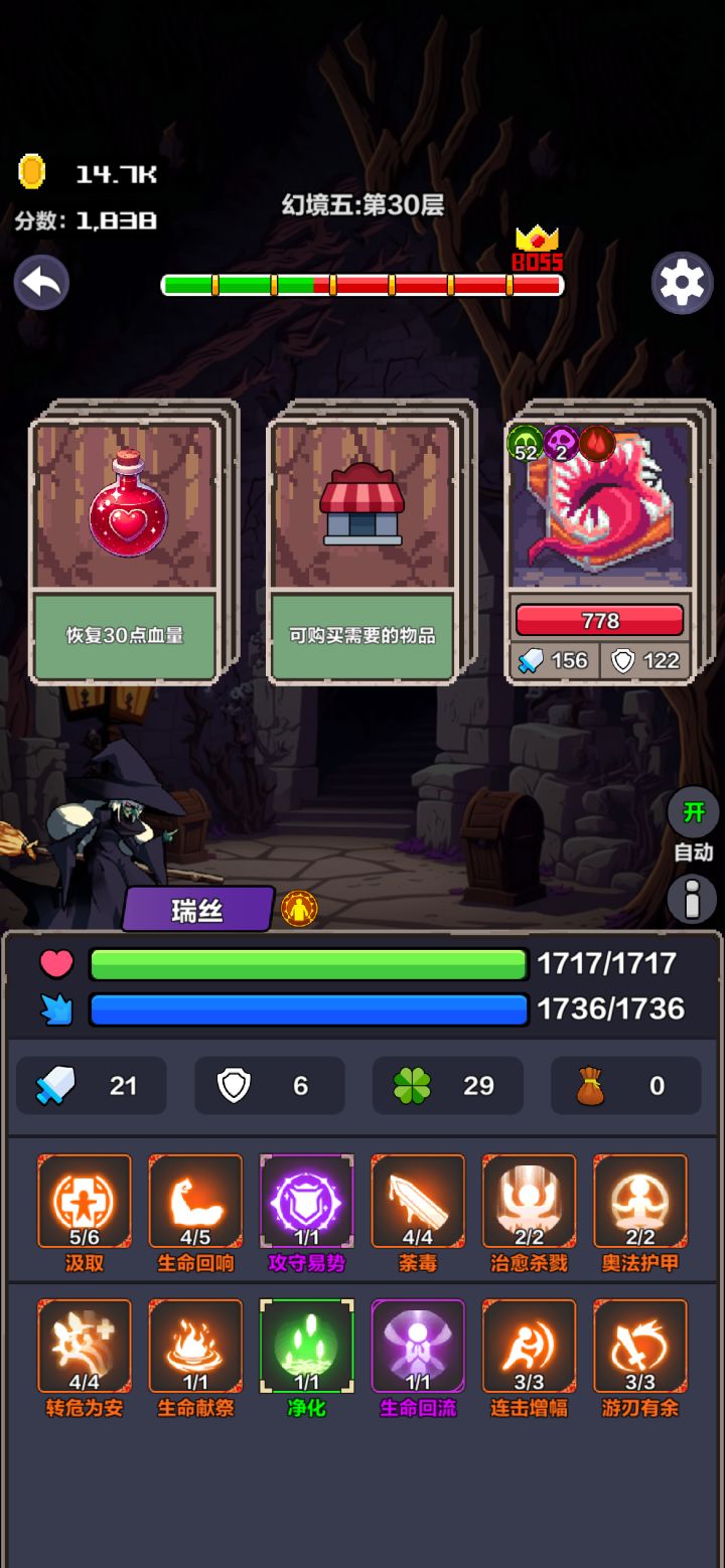 这游戏开局需要拿续航卡,只要不会被打死就能发育起来第一次开局直奔技能去,游戏内学到下次开局就能直接带,核心开局技能:转危为安,生命回响,魔法回流,人物天赋点点满就能带满这三个,具体怎么带看个人需求删除技能:把技能拖动就能看到,偶尔不太灵上限10个技能T0 汲取,唯一的自成长//转危为安+生命回响,唯二的百分比被动回复,主打苟得住怎么玩都行T1 奥法护甲,一级蓝条当护盾,二级护盾翻倍,安全
