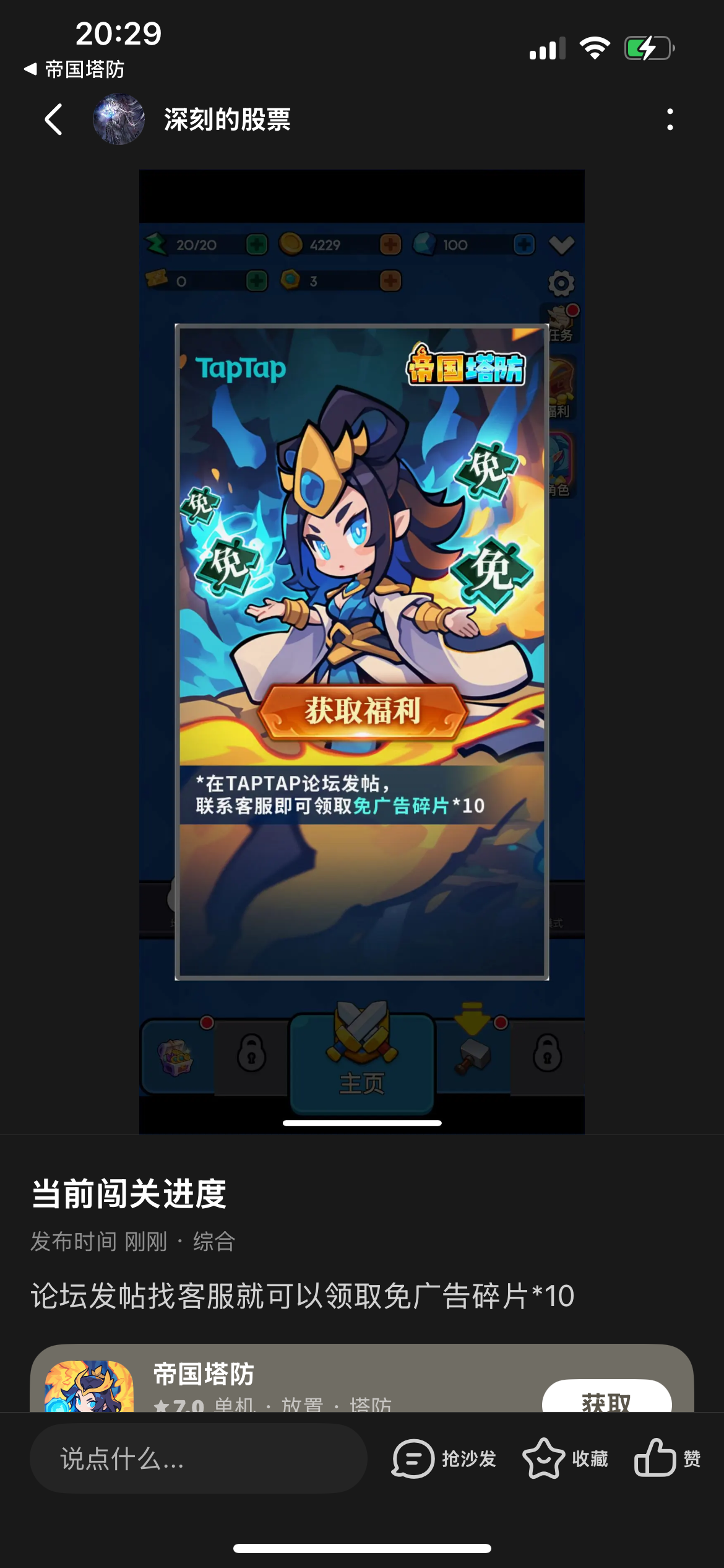 论坛发帖找客服就可以领取免广告碎片*10#发现好游戏