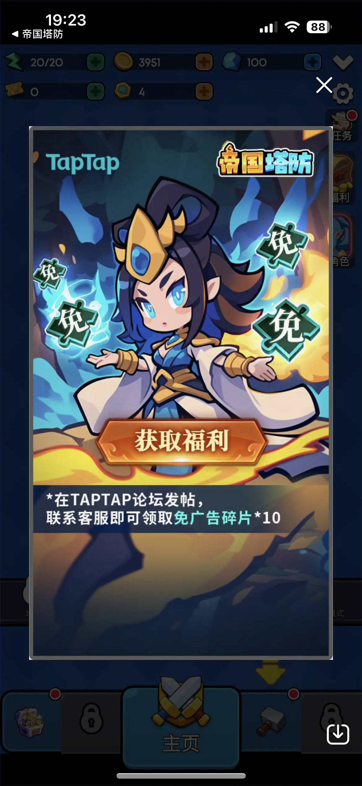 论坛发帖找客服就可以领取免广告碎片*10很好玩的一个游戏,不用氪金也可以玩的很爽