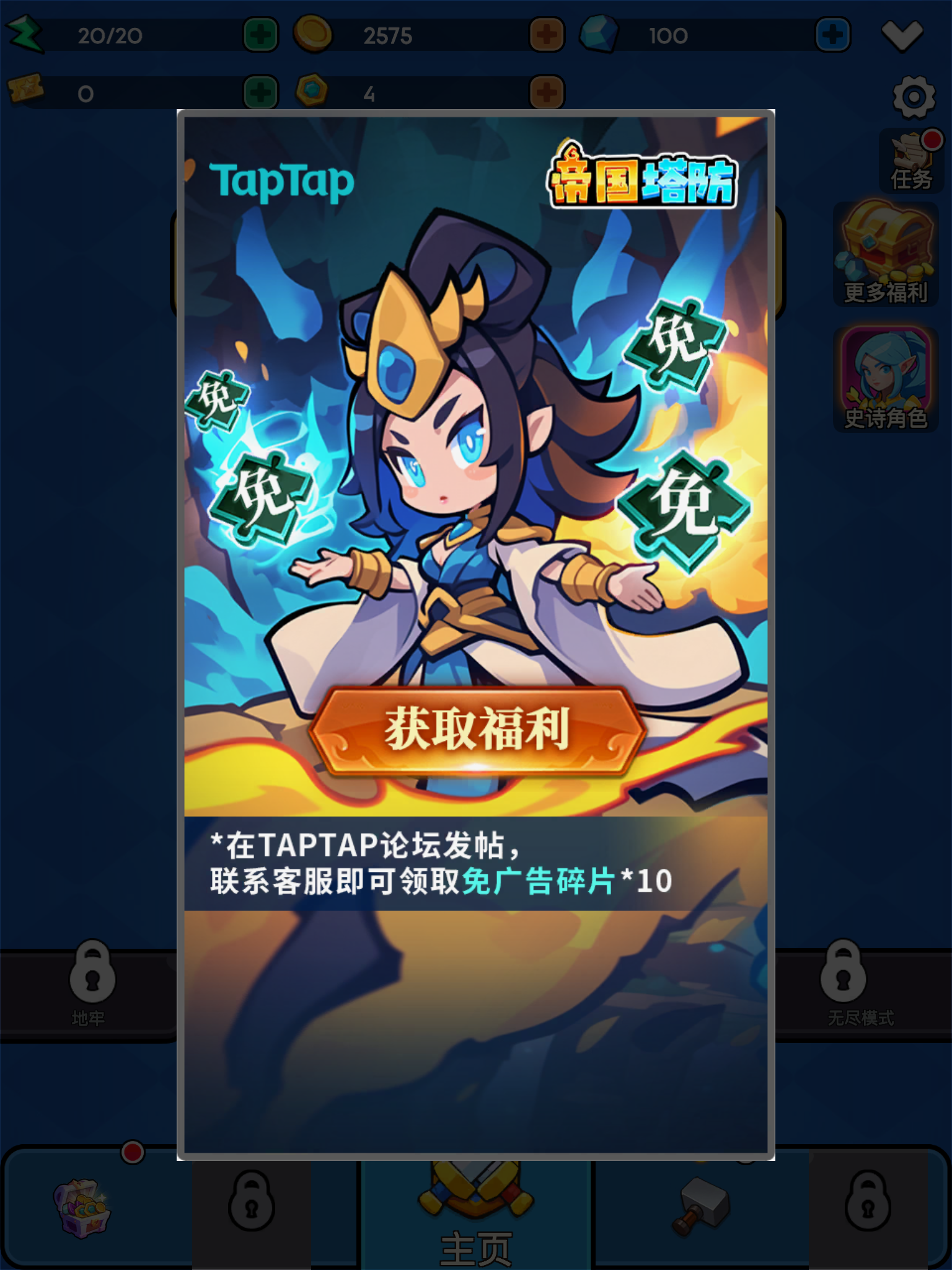 论坛发帖找客服就可以领取免广告碎片*10 #帝国塔防