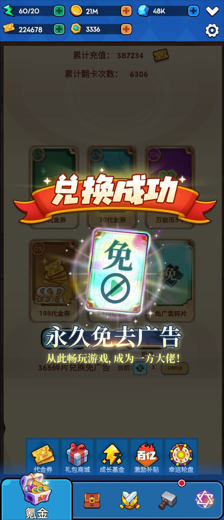 365个免广碎片可以兑换免广卡,看一次广告就是十连抽,百分之一的概率得一个碎片,从概率学角度只需要看十次广告就能得一个,总共只需要3650个广告,这游戏你就无敌了!