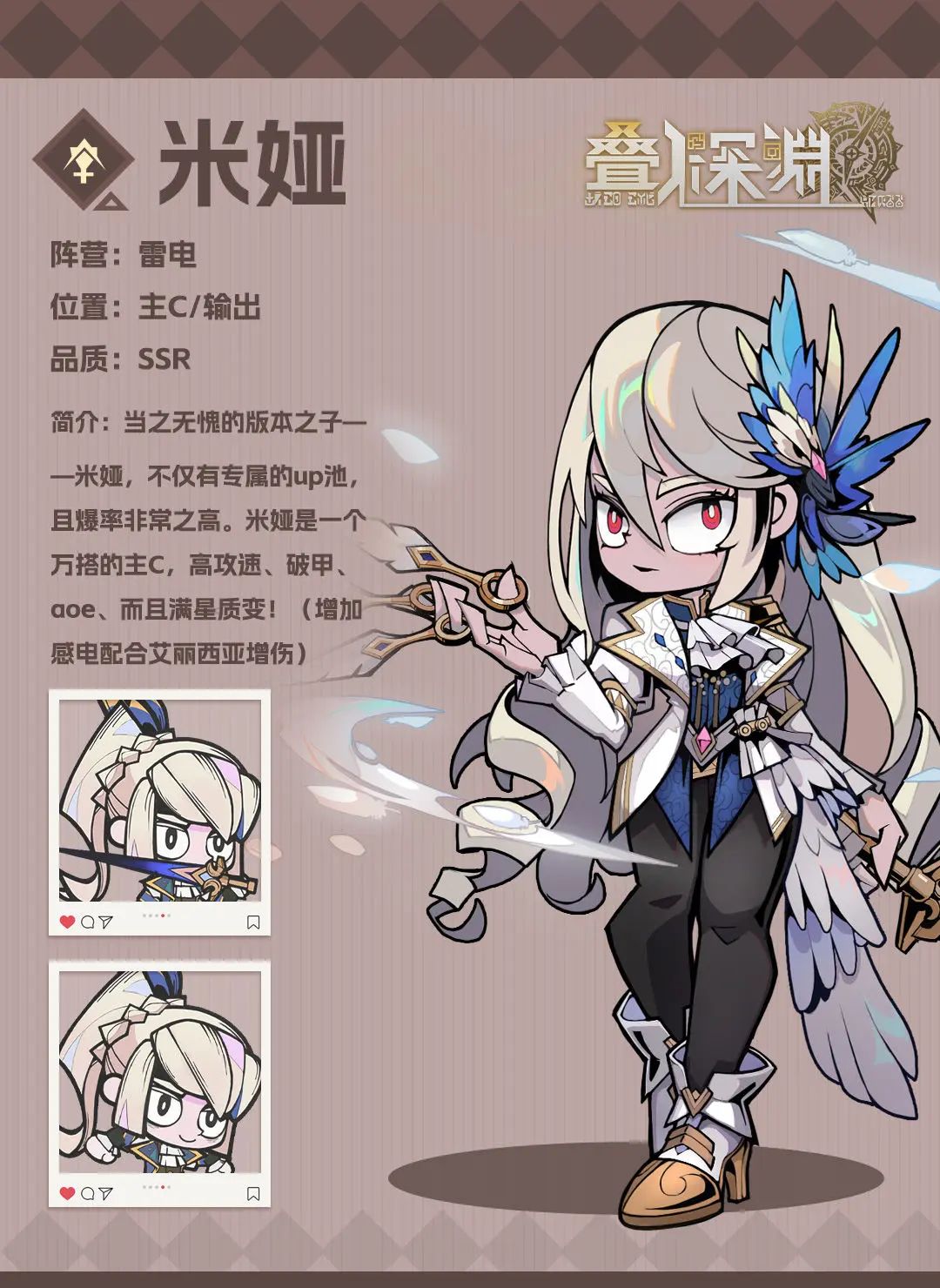 那我也给新手们来点实在的: 别再问自己抽到的这个角色好不好用了,统一回答一下。 T0:基本上必练 米娅/米神(SSR限定电系输出)、艾尔莎/平民战神(御四家sr火系输出)、吴迪/无敌(御四家sr火系奶妈+支援)、玛雅(SSR限定火系辅助)、诺尔/兔子(SSR火系护盾)、霍尔曼/雨伞哥(SSR冰系护盾) T1:好用,喜欢可以练 大卫/牢大(SSR火系输出)、艾丽西亚/雷奶(SSR电系奶妈)、尼亚/猫
