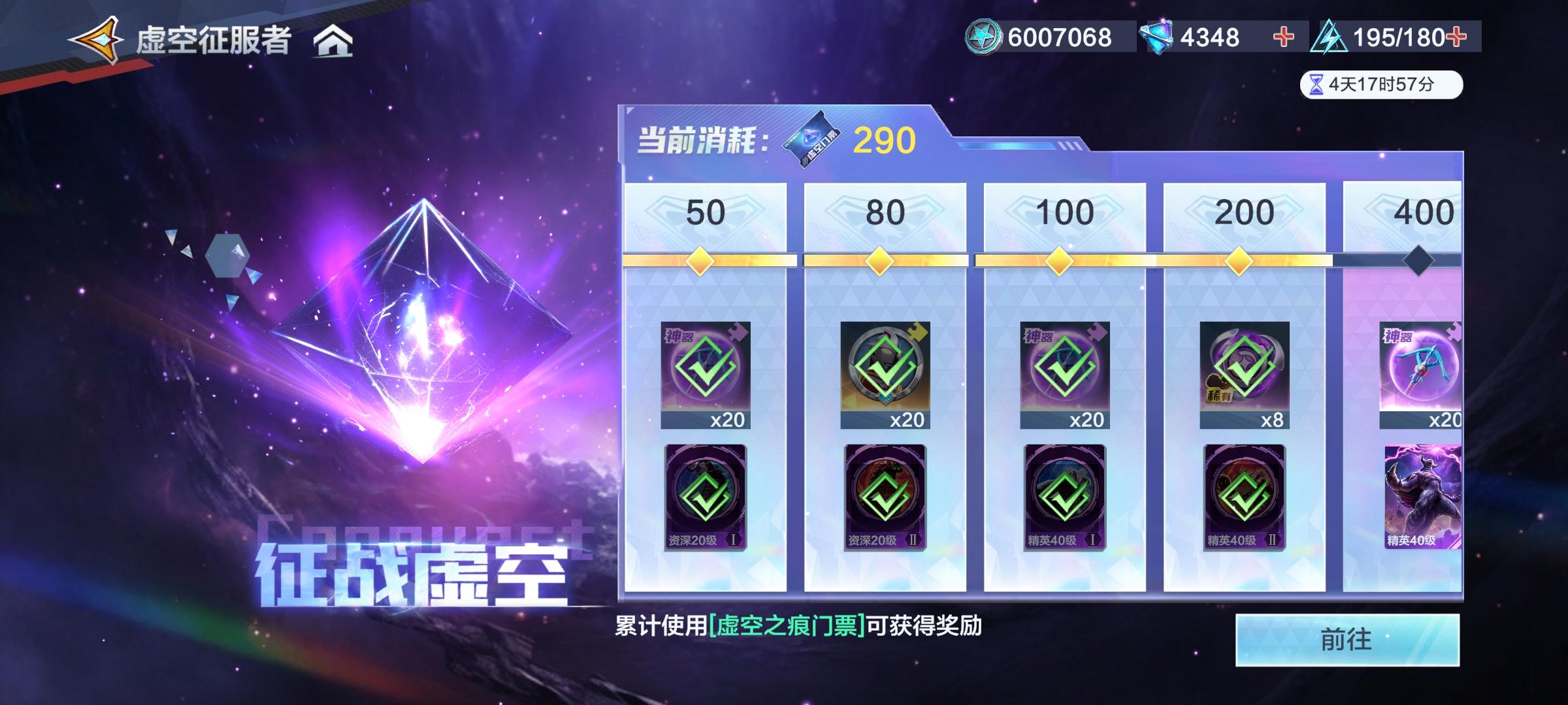 68+月卡。 五暗已齐。紫钻别用买自选专属。 第四天到这里已经没啥好肝的了。爬塔手动是真不想去爬。 残响无脑强化,战力提升高。我现在角色等级上限670。但我英雄才580,根本没体力去提升。 推图也起码还能过几个章节,没体力了。 优先推图,因为推图给残响强化上限,推不动刷英雄经验升级,继续推。 我们平民每天买体力只能买光70钻的体力。 没有体力打打共斗打打藏宝图就可以下线了。