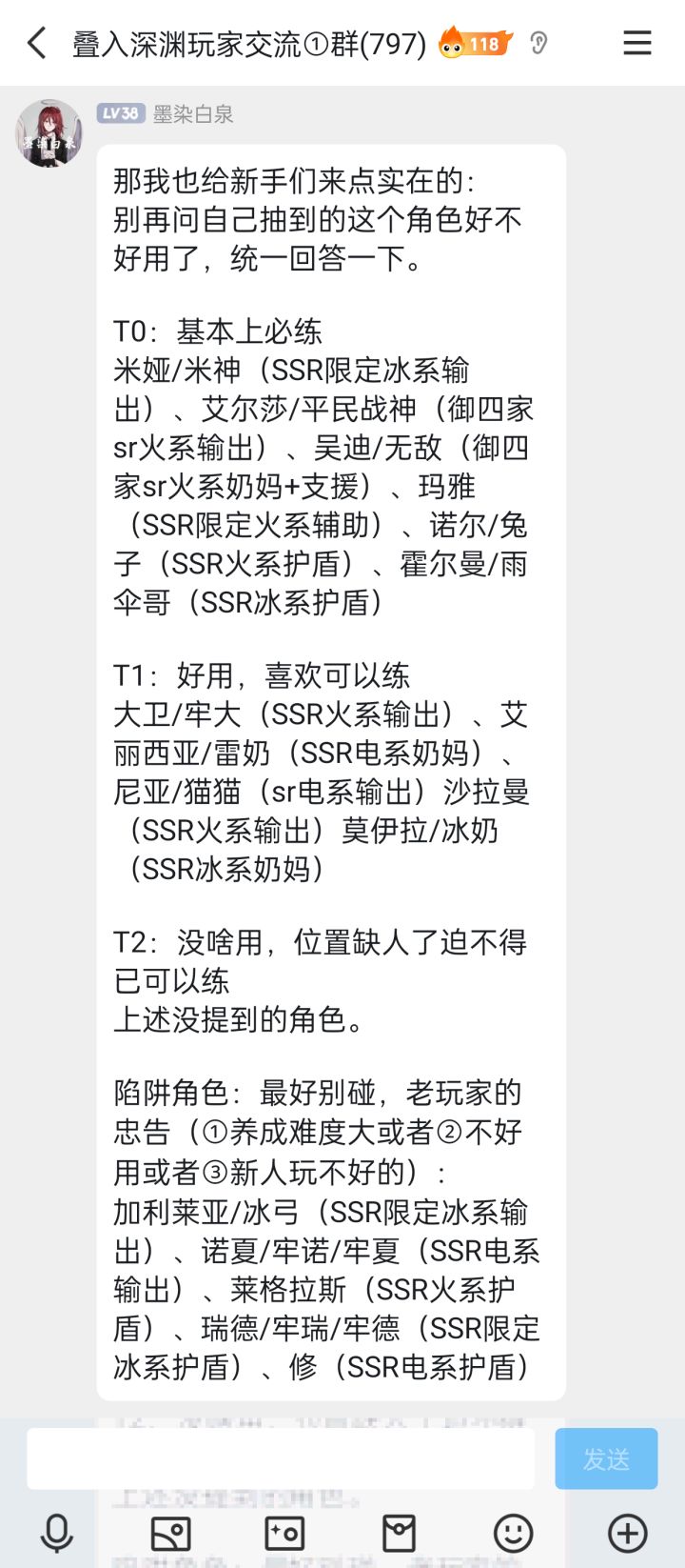那我也给新手们来点实在的:别再问自己抽到的这个角色好不好用了,统一回答一下。T0:基本上必练米娅/米神(SSR限定电系输出)、艾尔莎/平民战神(御四家sr火系输出)、吴迪/无敌(御四家sr火系奶妈+支援)、玛雅(SSR限定火系辅助)、诺尔/兔子(SSR火系护盾)、霍尔曼/雨伞哥(SSR冰系护盾)T1:好用,喜欢可以练大卫/牢大(SSR火系输出)、艾丽西亚/雷奶(SSR电系奶妈)、尼亚/猫