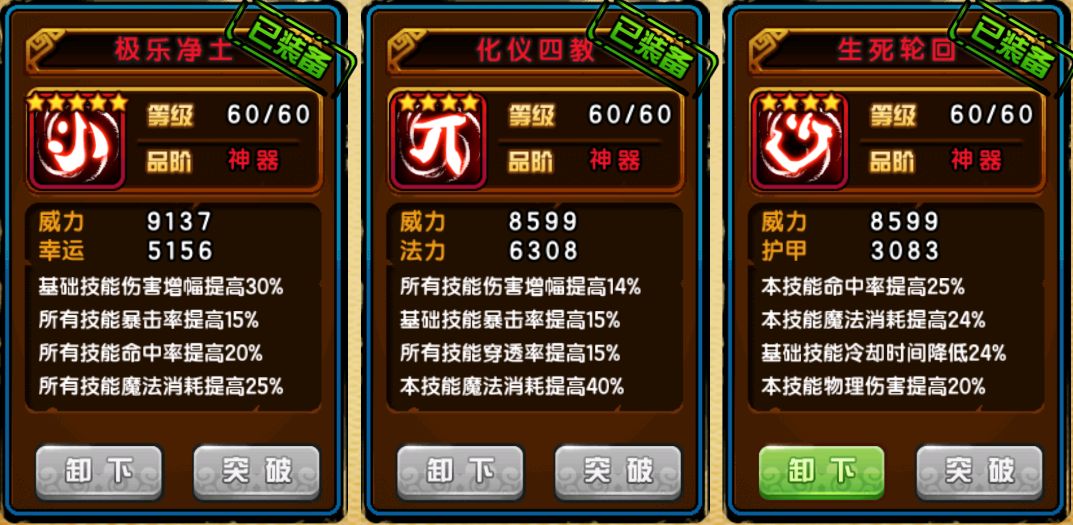 神·定海珠,cd36秒 前方出现一个领域,35.3秒时领域内敌人每隔1秒受到魔法伤害同时获得2秒镇压效果同时其双抗降低10%同时受到伤害提高50%,封疗2秒,持续7次。29.1秒时珠子落地,对前方敌人造成物理伤害同时造成镇压效果持续2秒,同时造成6秒重伤(免疫击飞,受到伤害提高50%,双抗降低50%) 神·八宝琉璃瓶,cd36秒 使用后清除并免疫大部分负面状态持续1秒,然后获得50%伤害增幅持续8
