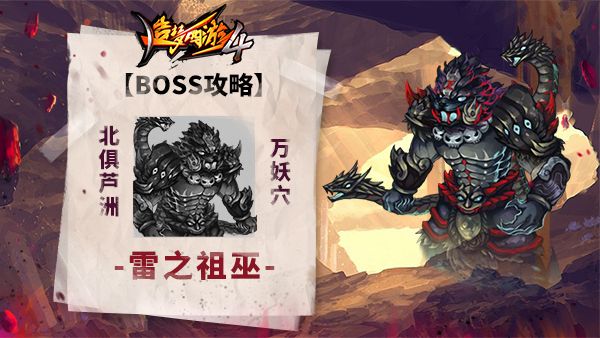 BOSS名称:雷之祖巫BOSS简介:雷之祖巫强良,十二祖巫之一,被通天教主释放之后,前往地底深窟,封印雷公雷震子法力,并于万妖穴施下大法。出没地点:万妖穴BOSS技能:>撕天巨力:挥舞巨爪攻击前方及附近的敌人>震天长啸:张开血盆大口,朝天空发出一阵长啸,将洞窟顶部的岩石震落。>震地重击:用手重重锤击地面,地面震动,伤害站在地面的敌人并造成眩晕。>回声怒吼:往敌人所在方向发出回旋音波,
